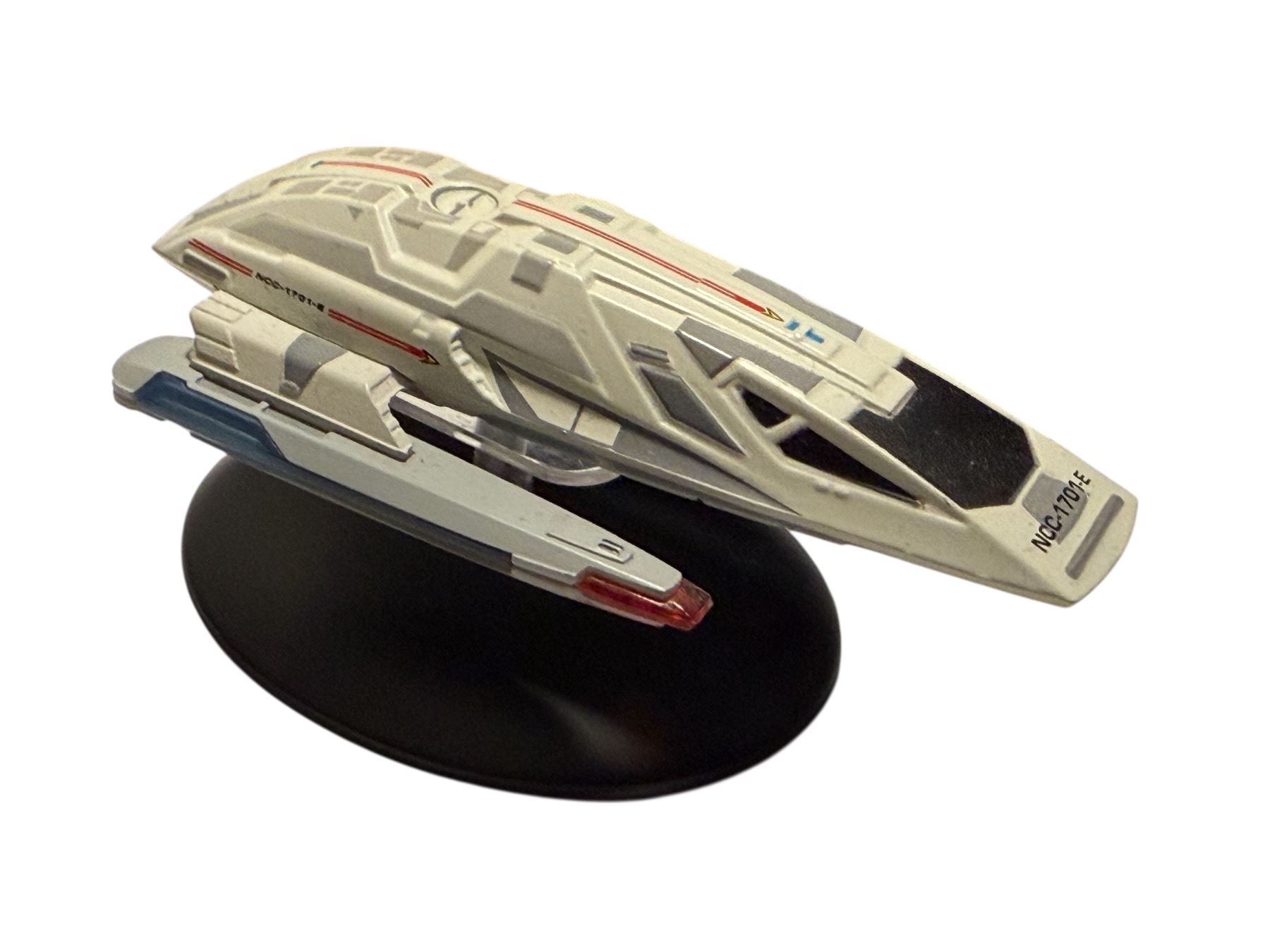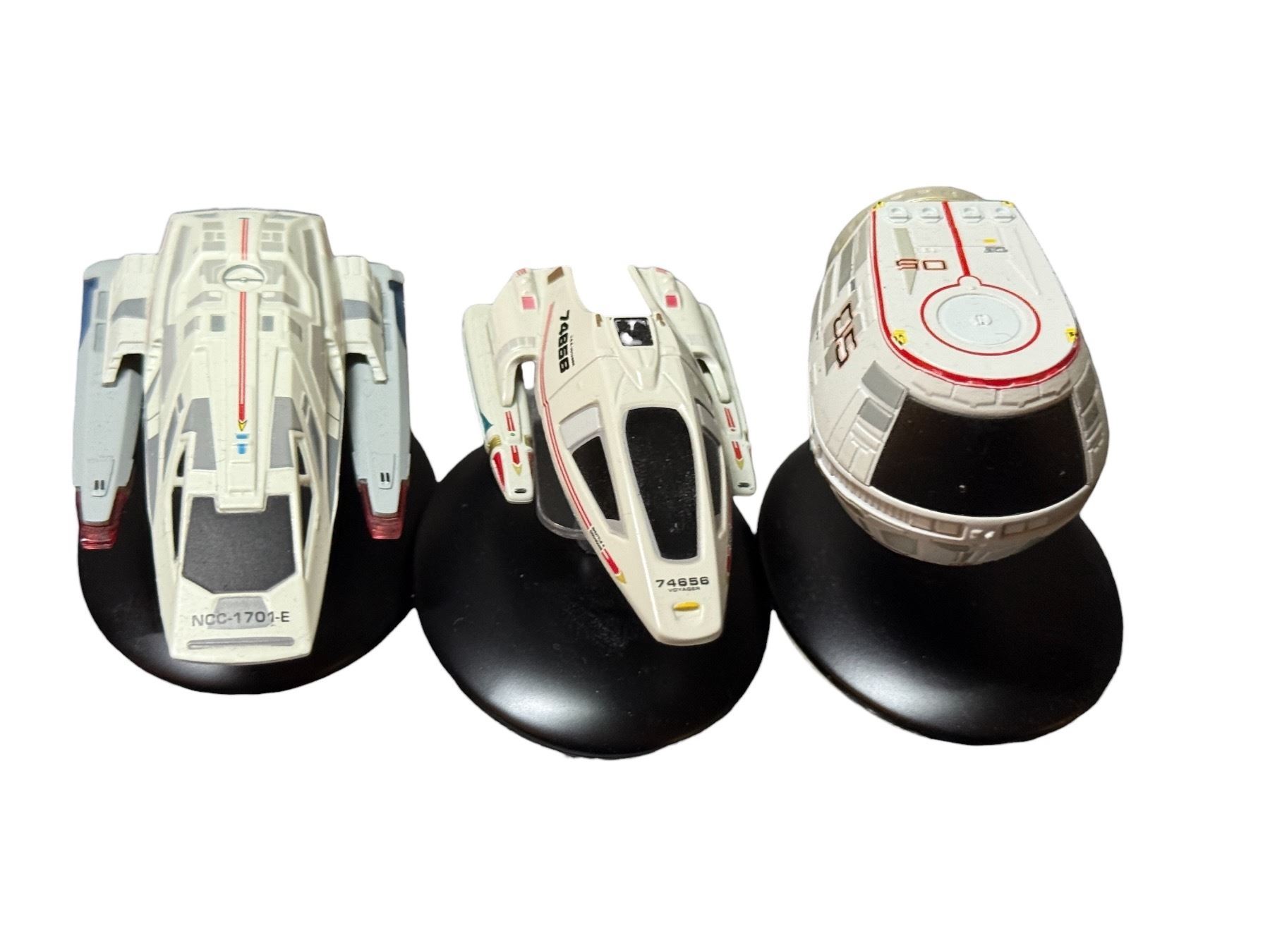 3pc Star Trek Starship Models - Orbital Office Travel Pod 1346-A/D 2021, Shuttlecraft Goddard 3127-A/B, Shuttlecraft Hawking 3231-A/A CBS Studios Inc. (with base & stand). DOESN'T INCLUDE BOX(ES)