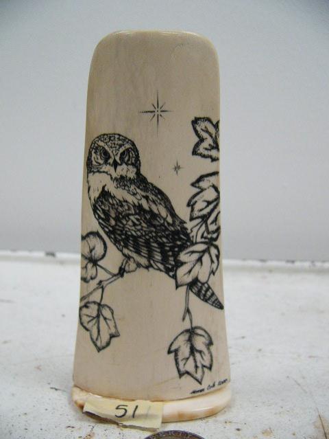 4-3/4" scrimshawed mammoth ivory of an owl sitting on a tree limb by Homer Cole (114)