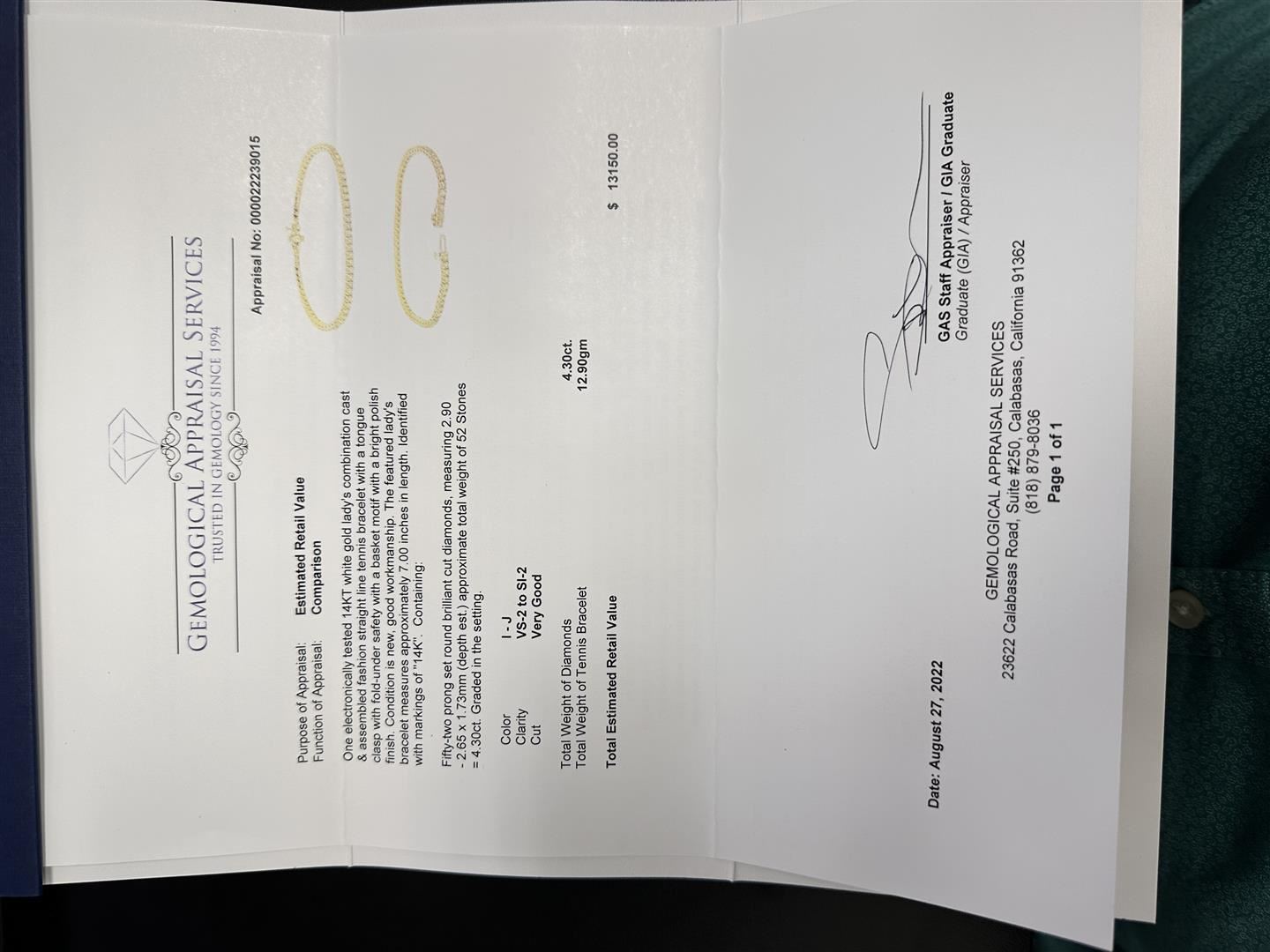 One electronically tested 14KT white gold lady's combination cast & assembled fashion straight line tennis bracelet with a tongue clasp with fold-under safety with a basket motif with a bright polish finish. Condition is new, good workmanship. The featured lady's bracelet measures approximately 7.00 inches in length. Identified with markings of 14K. Containing: 52 prong set round brilliant cut diamonds, approximate total weight of 52 stones = 4.30 ctw. Graded in the setting. Total weight of Diamonds: 4.30 ctw. Total weight of Tennis Bracelet 12.90gm. Total estimated retail value: $13150