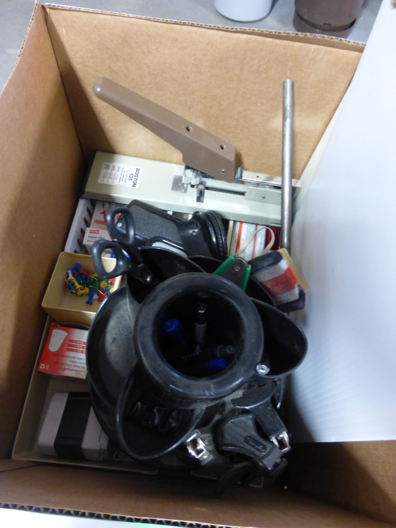 4 BOXES OF OFFICE SUPPLIES, SIGNS, PAPER, FILE FOLDERS, ETC
