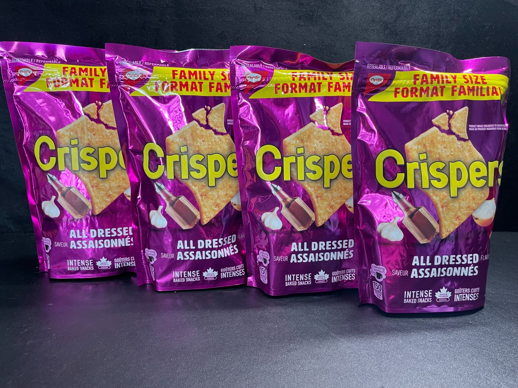 4 Bags of Crispers Baked Snacks; Family Size Bags - All Dressed - 240g Each - BB: JL 27/2025
