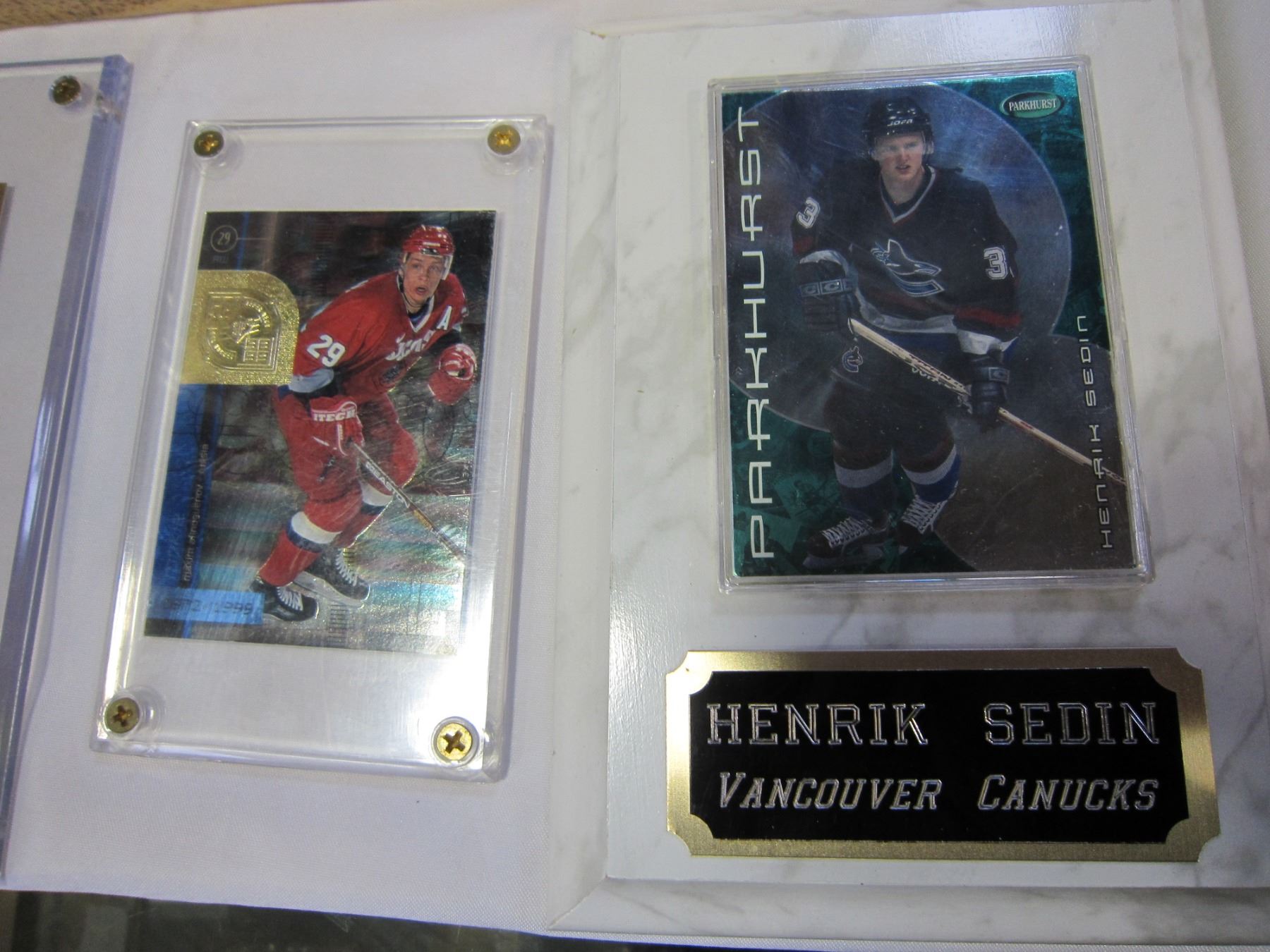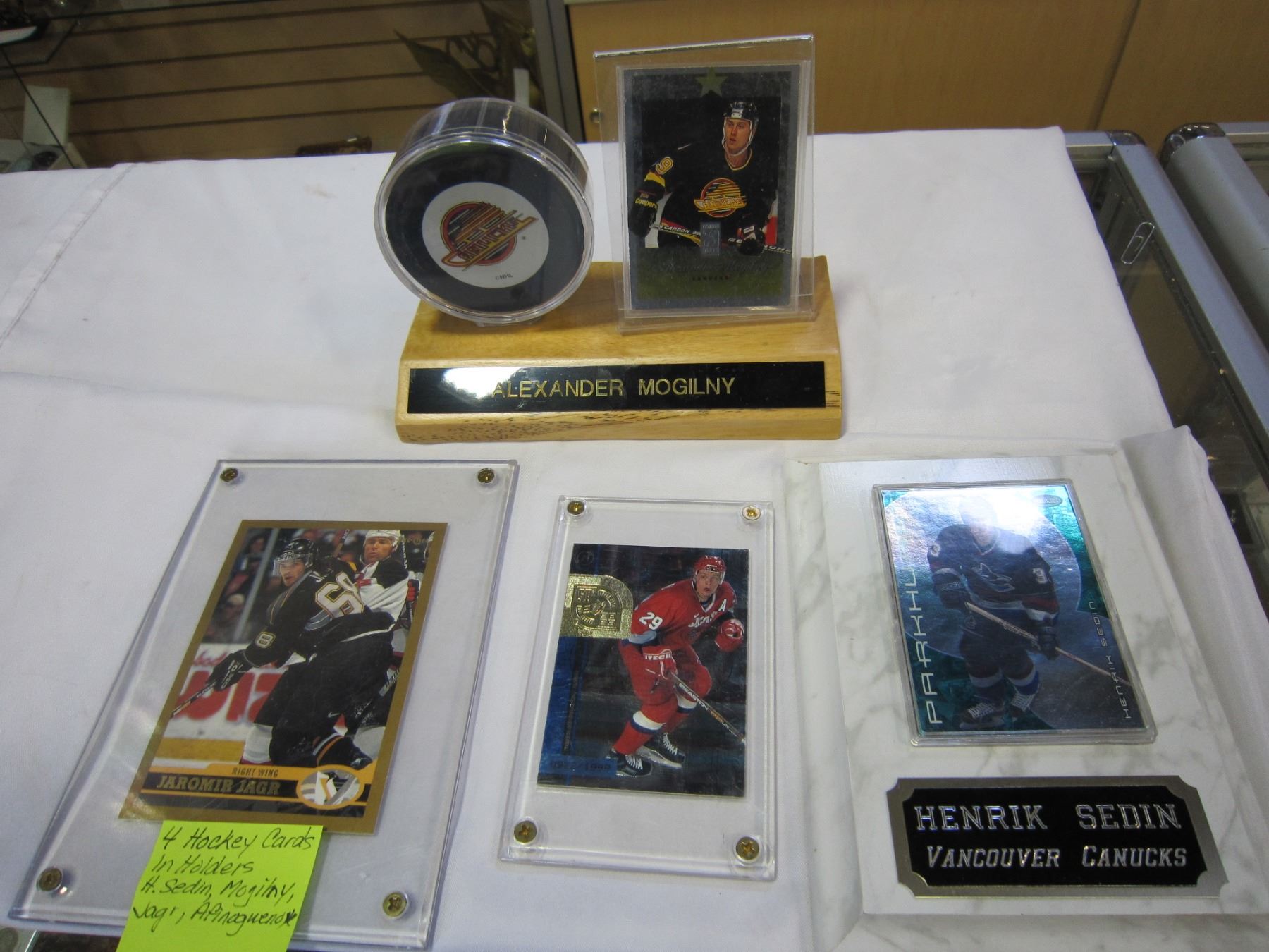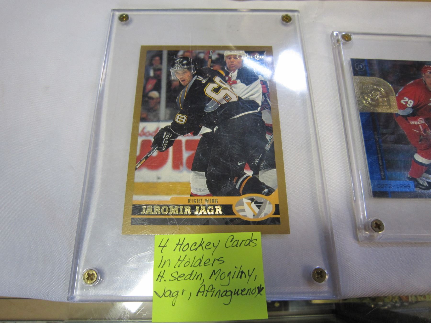4 HOCKEY CARDS IN HOLDERS, HENDRIK SEDIN, ALEX MOGILNY, JAROME JAGER, AFINOGUENOV