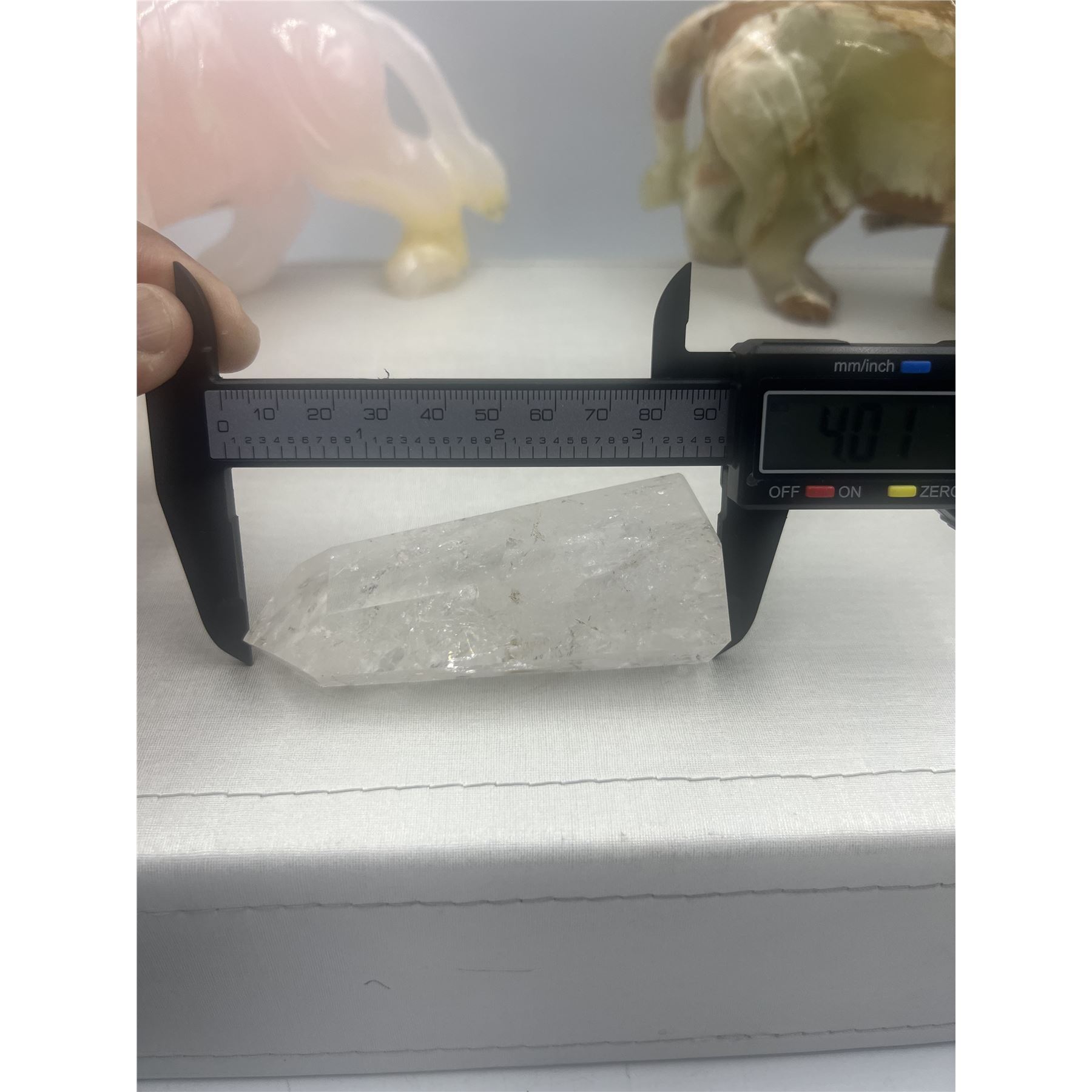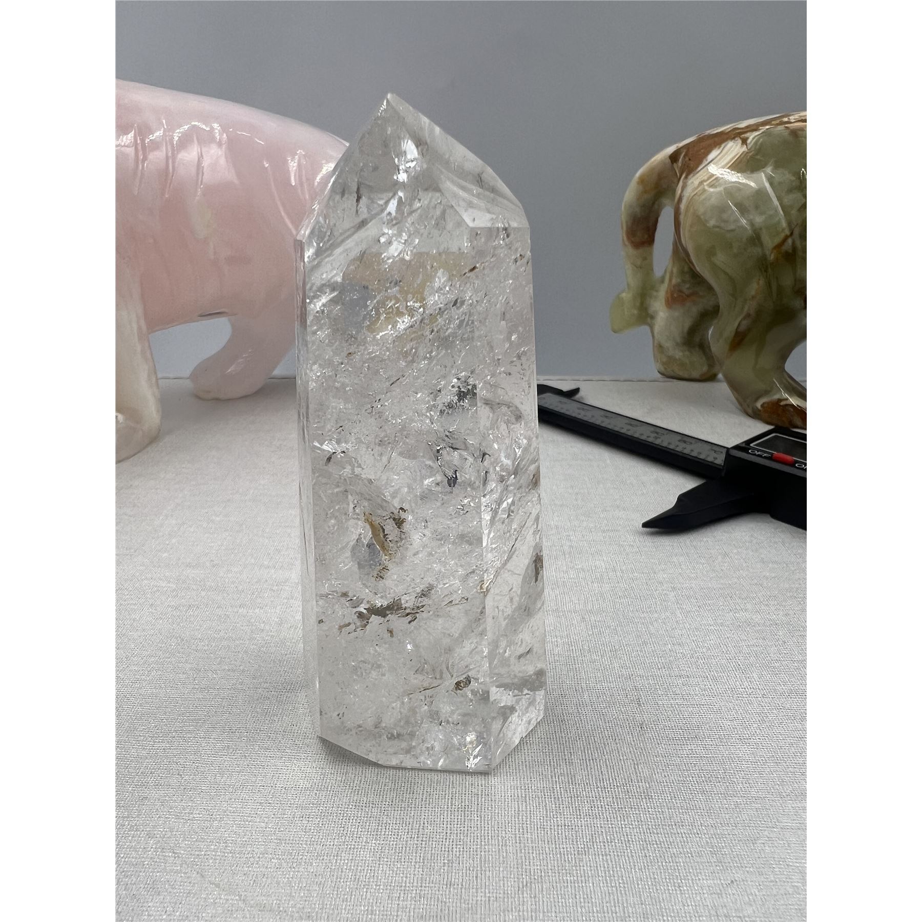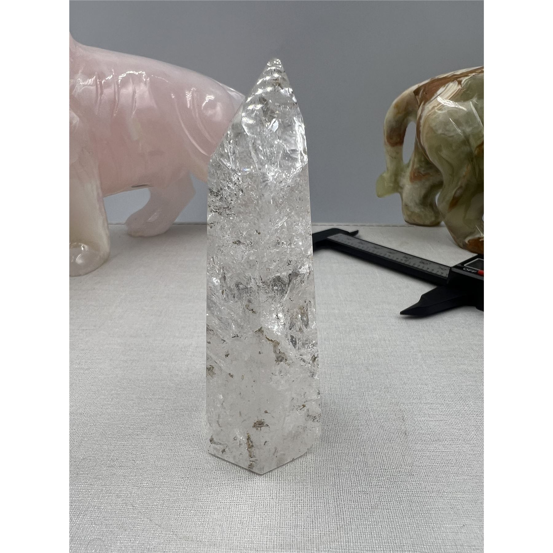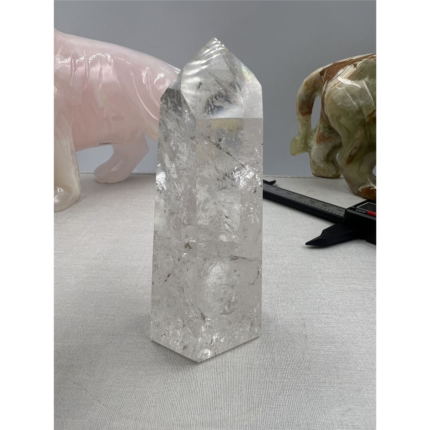 4 INCH CLEAR QUARTZ TOWER IN AURA INCULSION