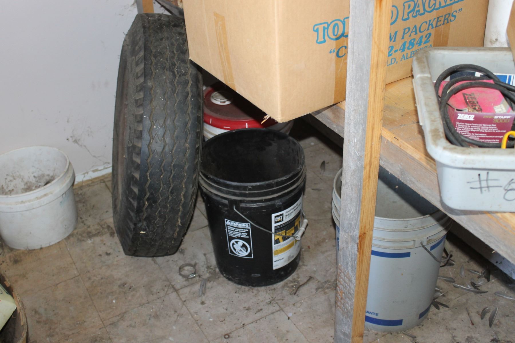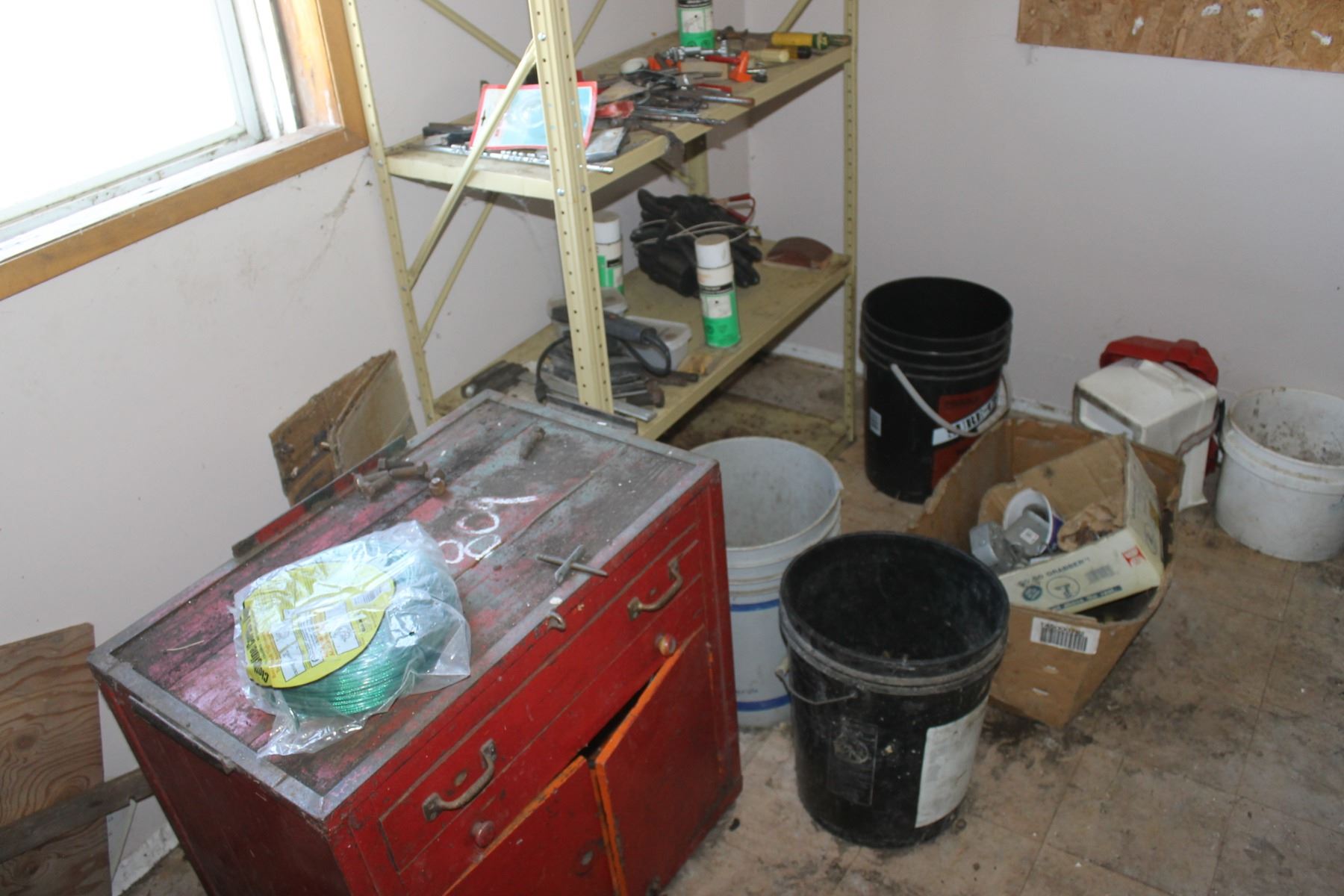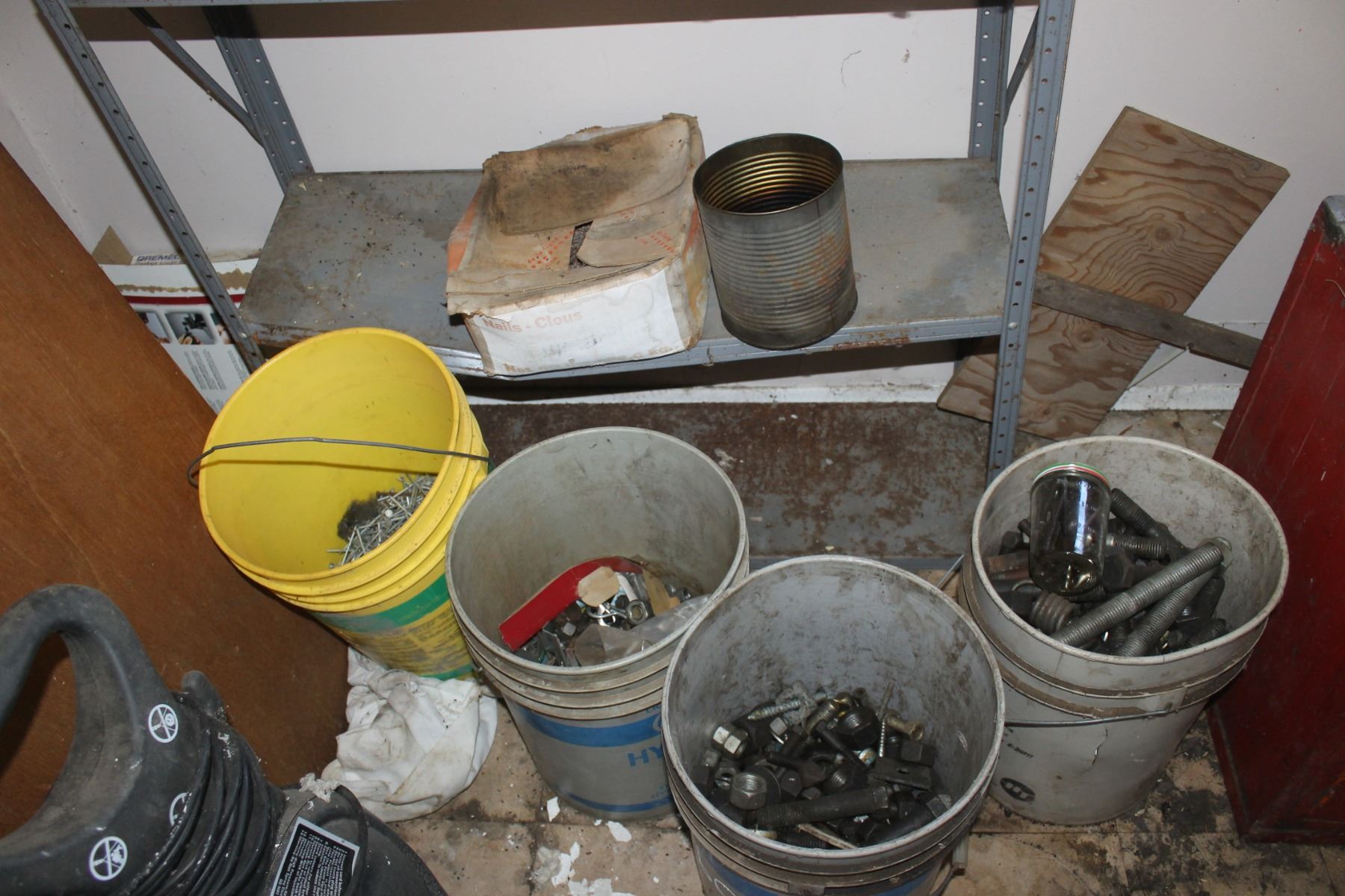 4 PAILS OF PARTS, HARDWARE, METAL SHELF, RED TOOLBOX, TOOLS, ETC