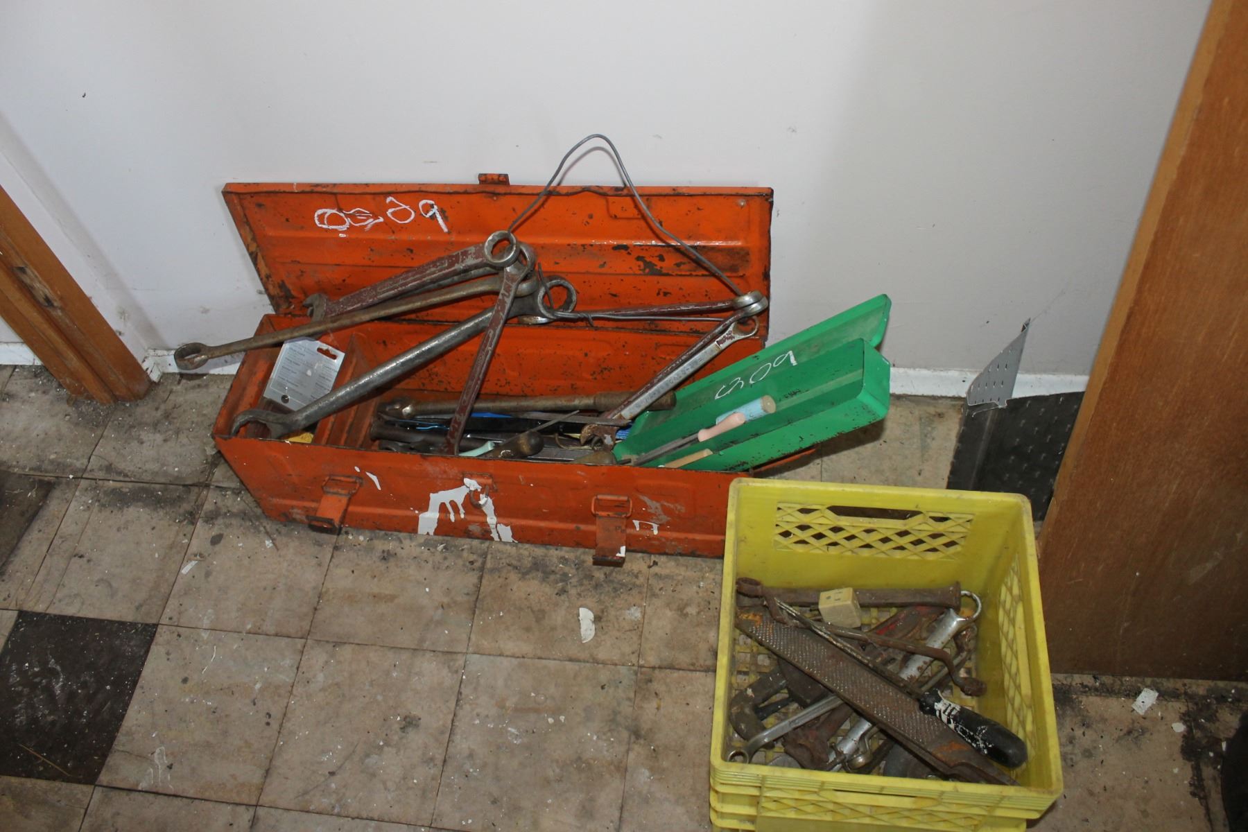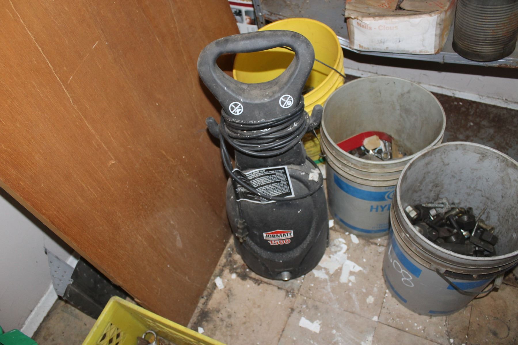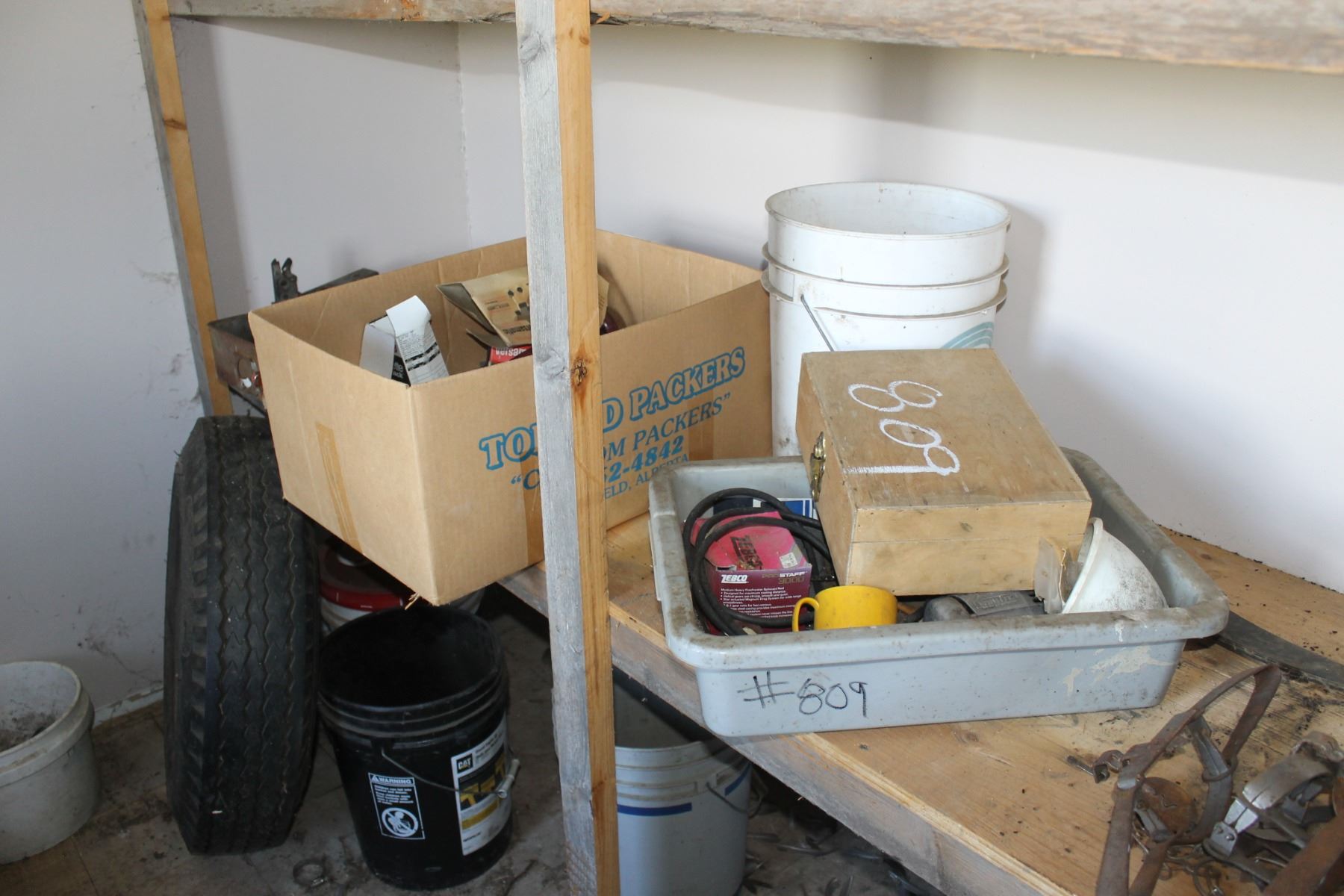 4 PAILS OF PARTS, HARDWARE, METAL SHELF, RED TOOLBOX, TOOLS, ETC
