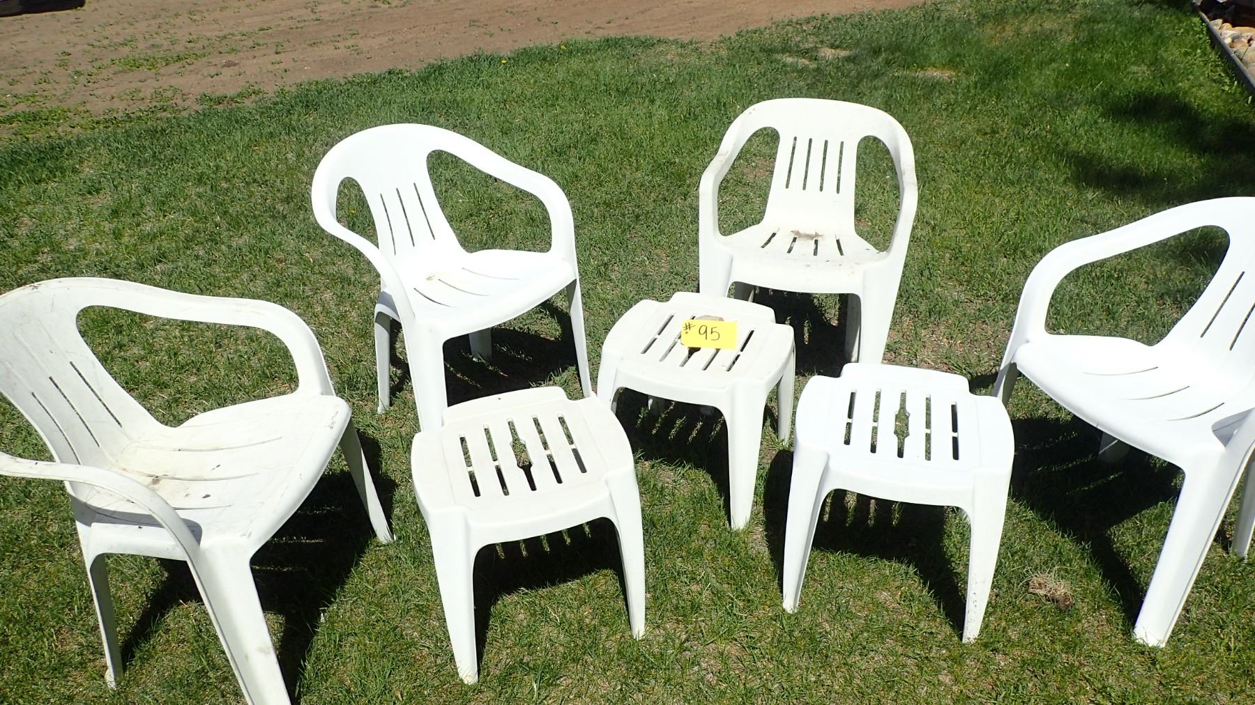 4 PLASTIC CHAIRS & THREE TABLES