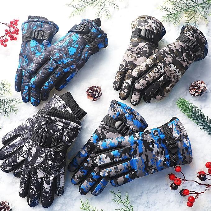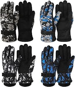 4 Pairs Kids Winter Gloves Kids Snow Ski Gloves Children Warm Gloves Waterproof Gloves (Blue, Gray, Black, Camouflage)