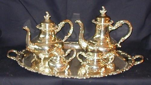 Sterling (marked) 4 pc Coffee & Tea Service; Stamped Original Alt-Heidelberg; with French Motif; Coffee 11"; Tea 9 1/2"; Cream 5"; Sugar 5 1/2"; Double Handled Tray (Silver Plate) 26 1/2" x 18" marked Alt-Heidelberg