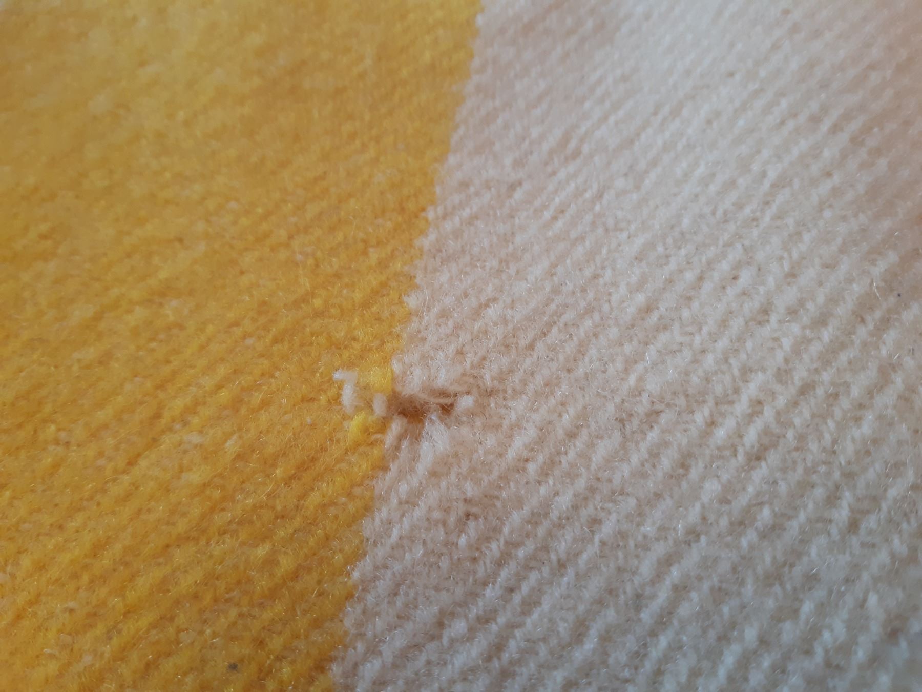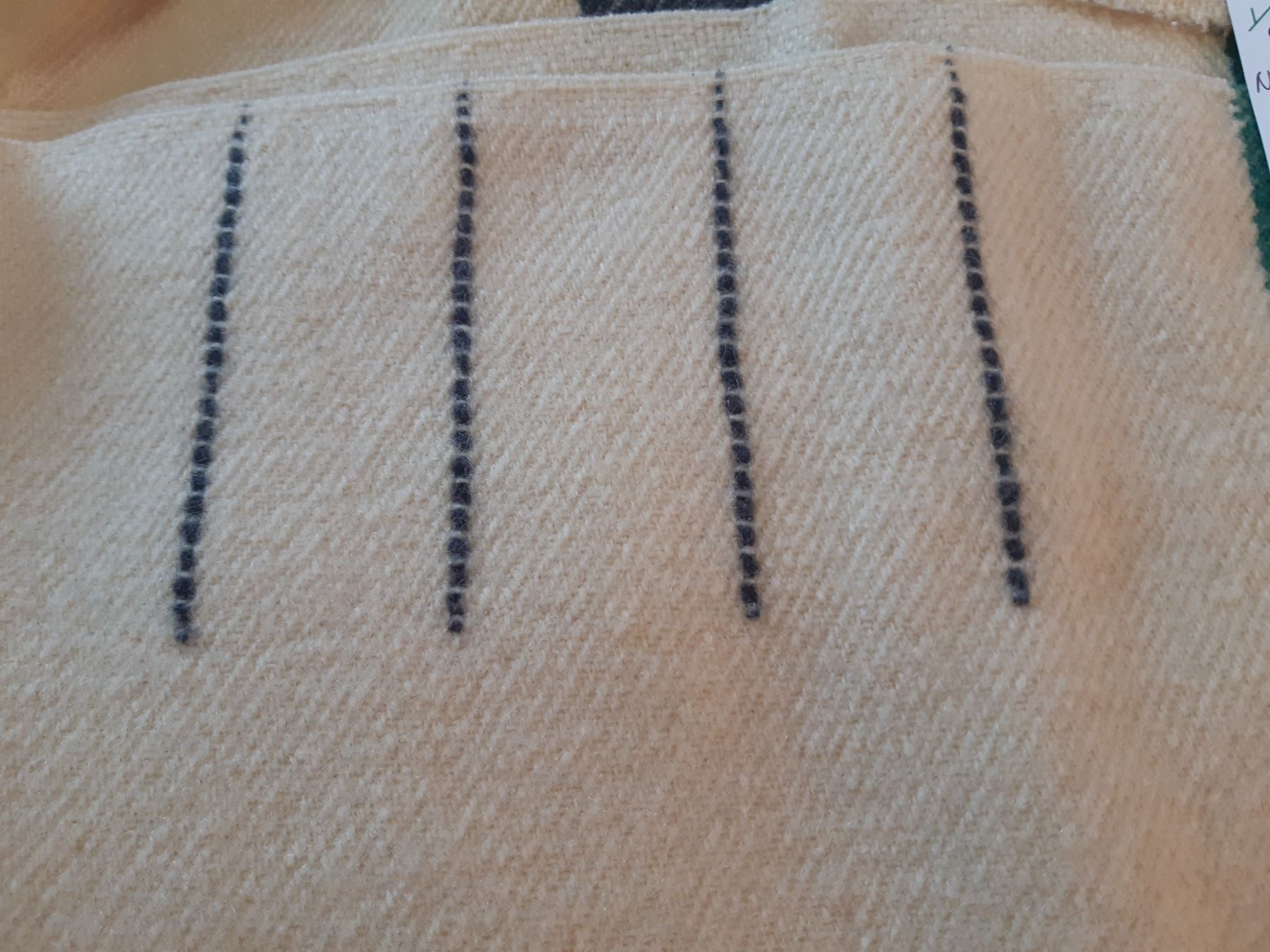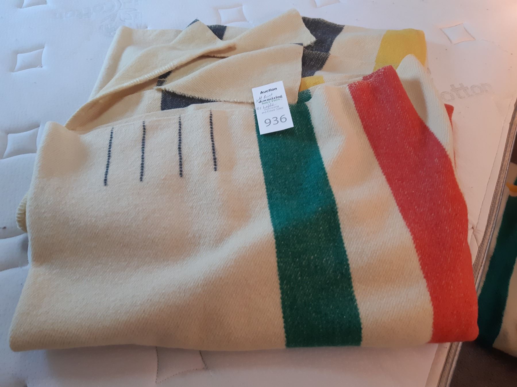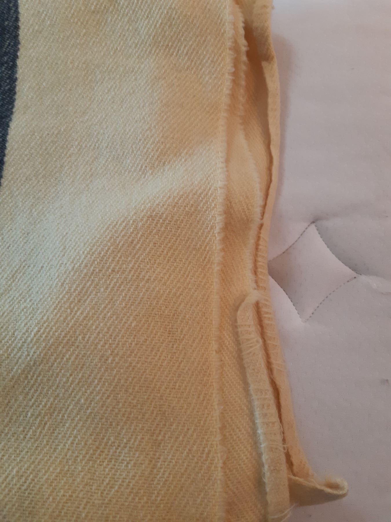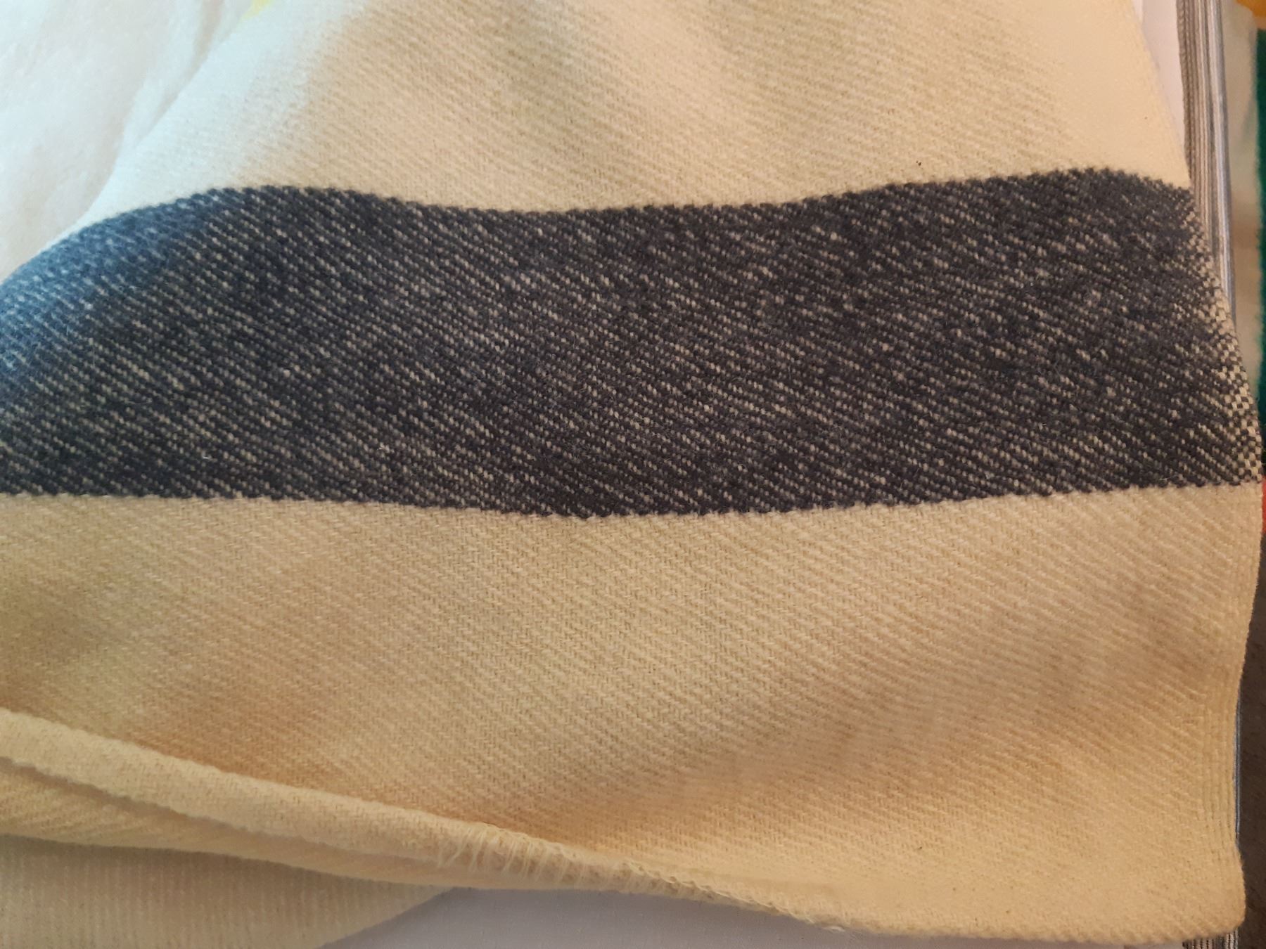 Wool blanket. Note lots of fraying on edges and moth hole. No lable quite thin. Pickup at 11 am