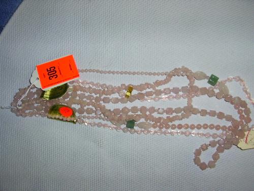 4 rose quartz necklaces. Mixed shapes and sizes, including faceted, nuggets, chips.