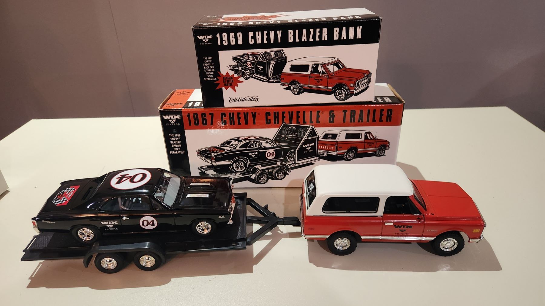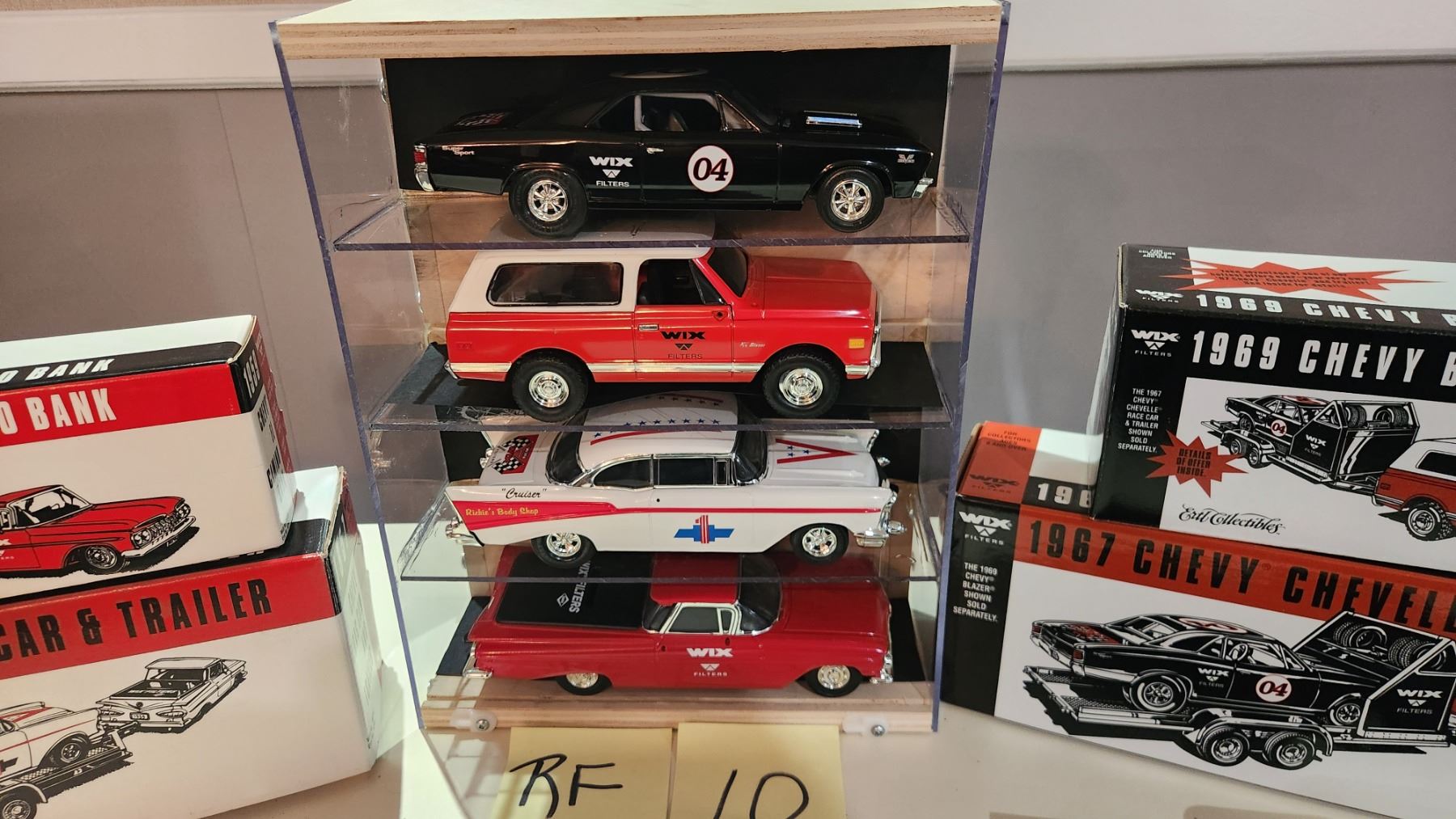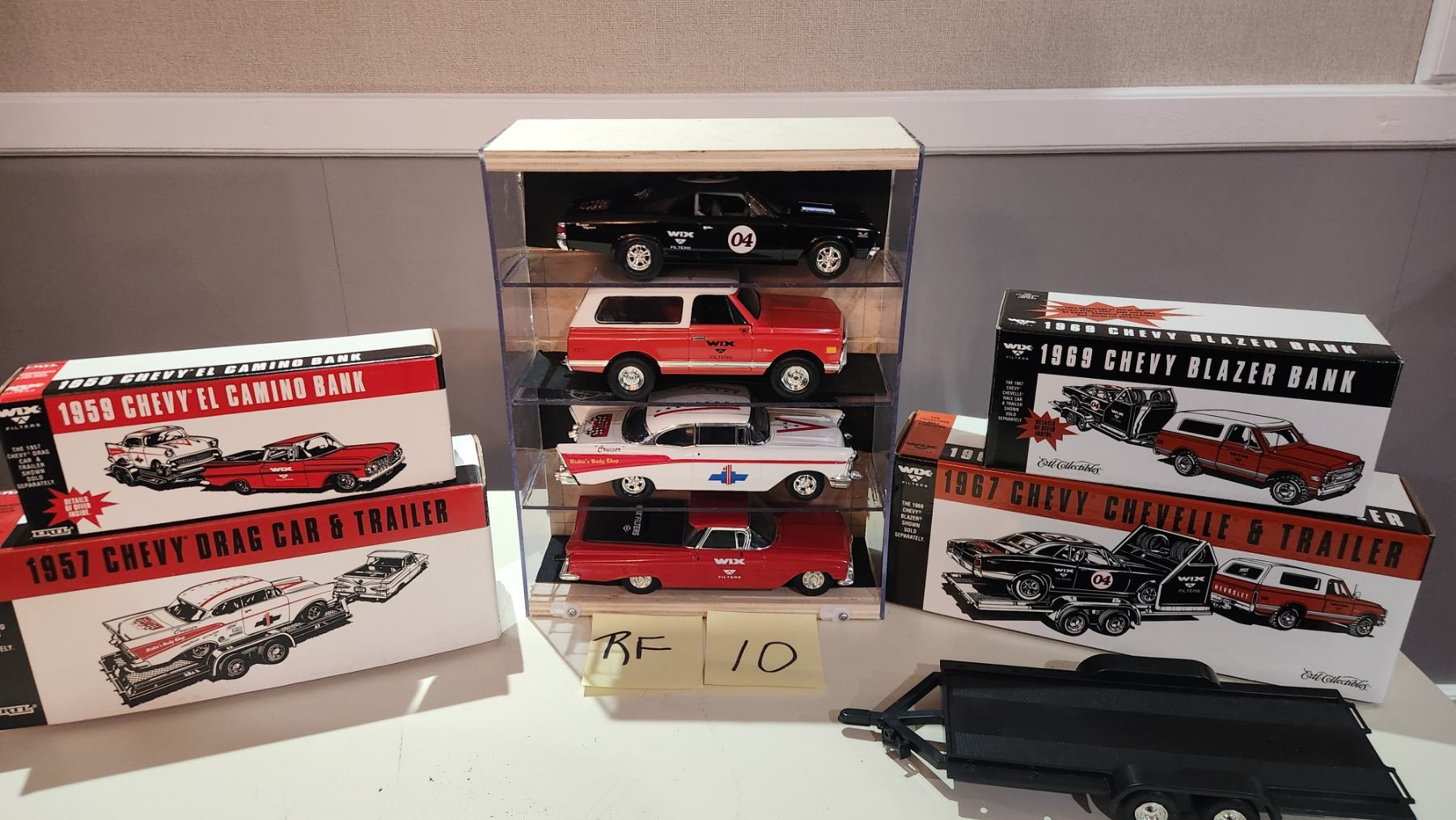 4-Tier Replica Display – 2 Sets WIX Chevy Banks 1957/1959/1967/1969, ERTL 1/24 with 2 Trailers and Original Boxes