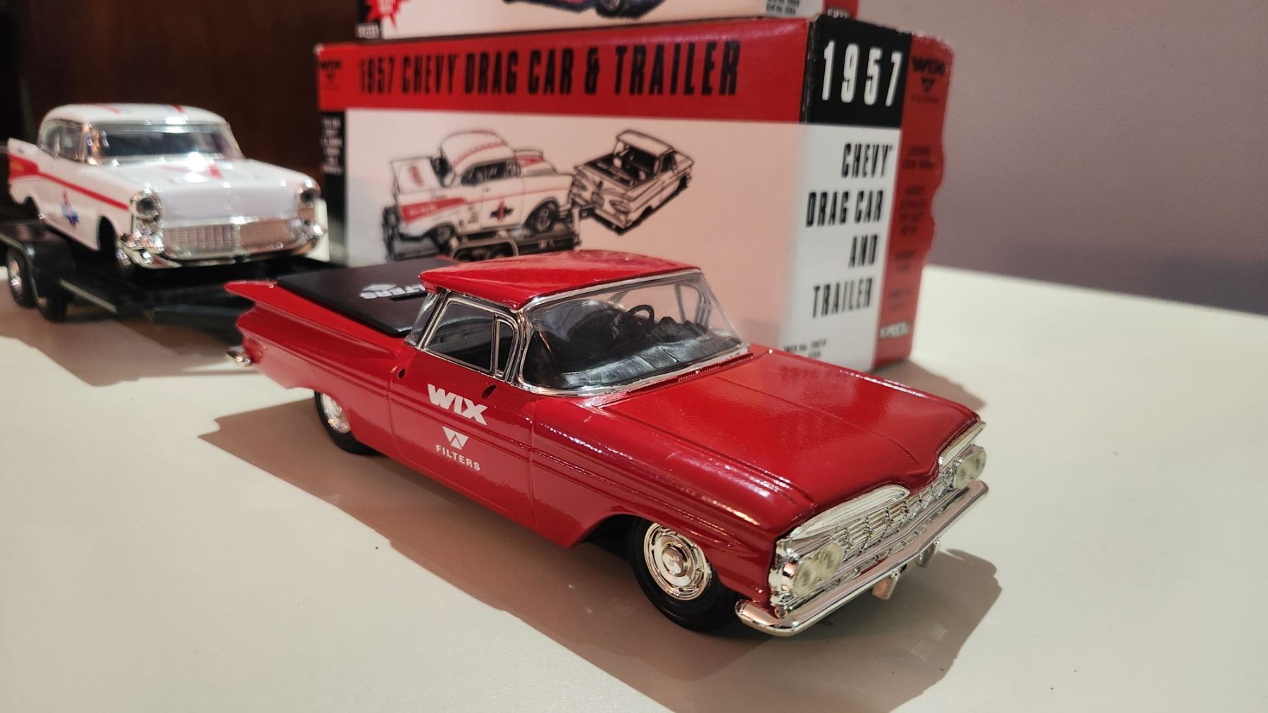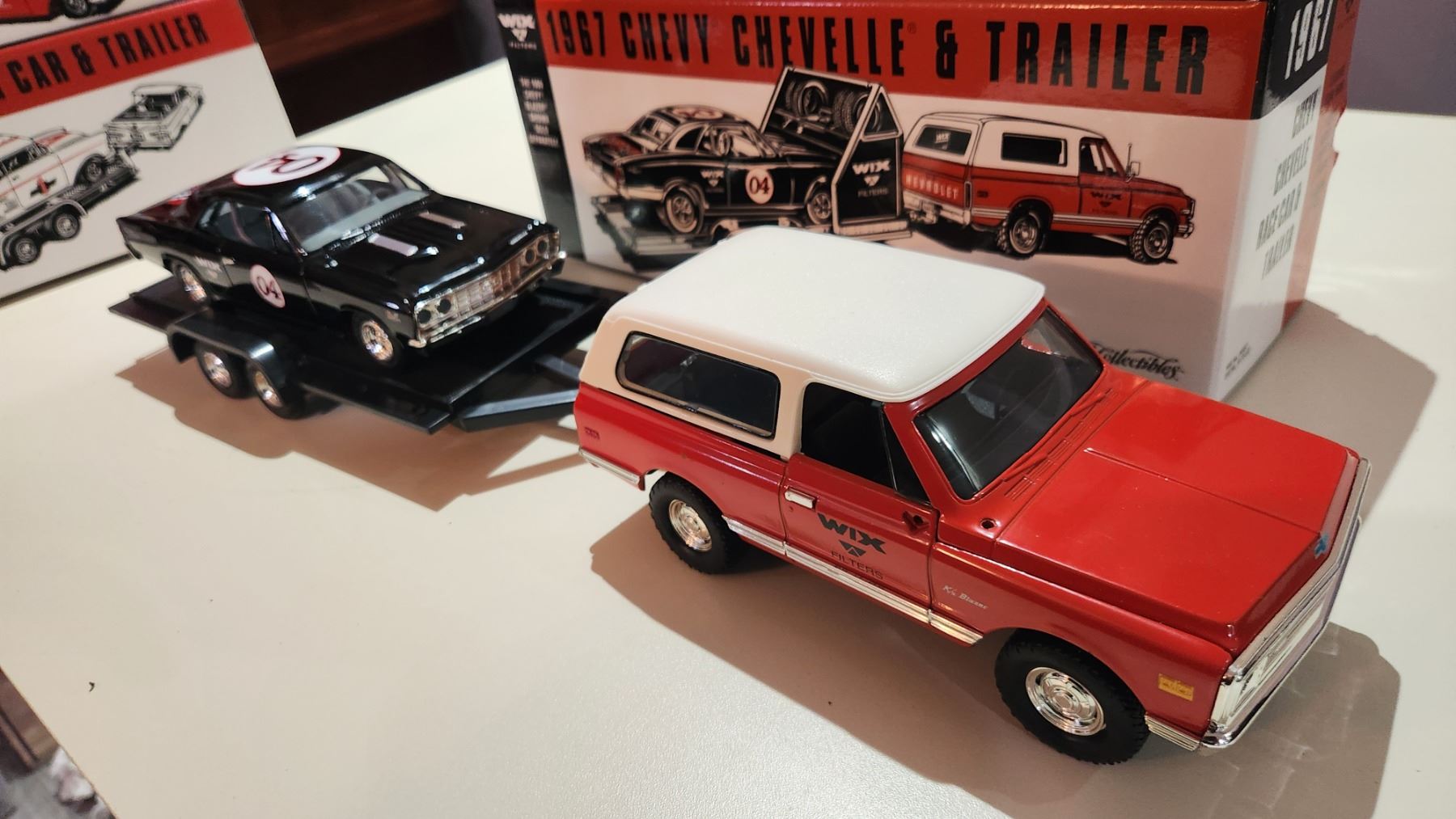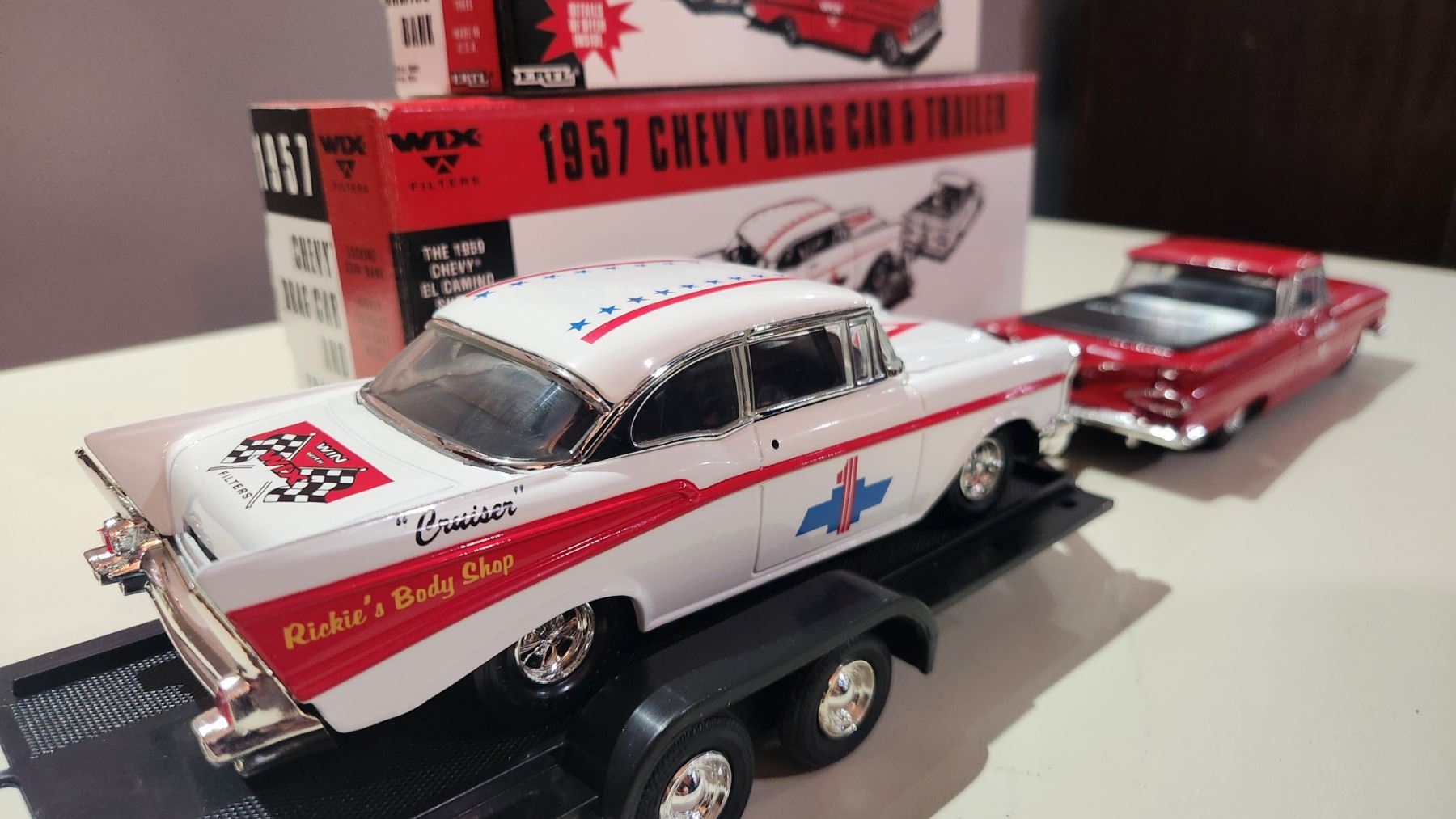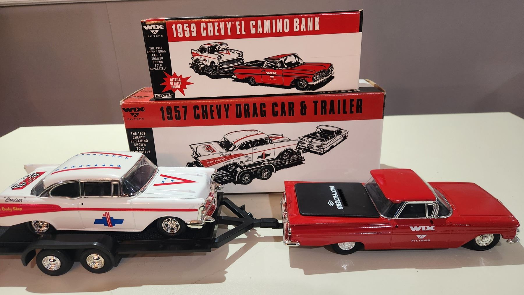 4-Tier Replica Display – 2 Sets WIX Chevy Banks 1957/1959/1967/1969, ERTL 1/24 with 2 Trailers and Original Boxes