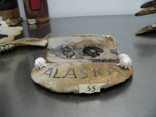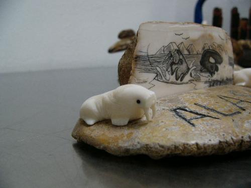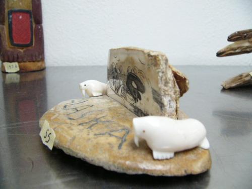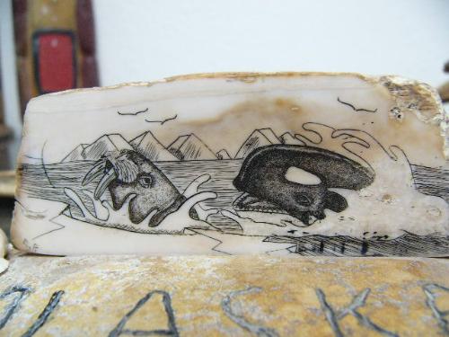 4" scrimshawed fossilized ivory piece, scrimshawed with walrus and a killer whale- has 2 small walruses on either end mounted on whale vertebrae by E. P. ()