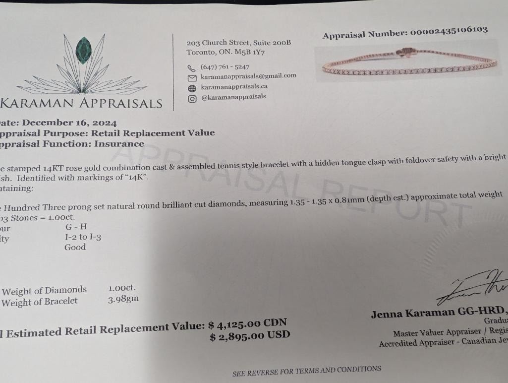 $4125, 14K(3.98g), NATURA DIAMOND (1ct)BRACELET 7", appraised value $4125