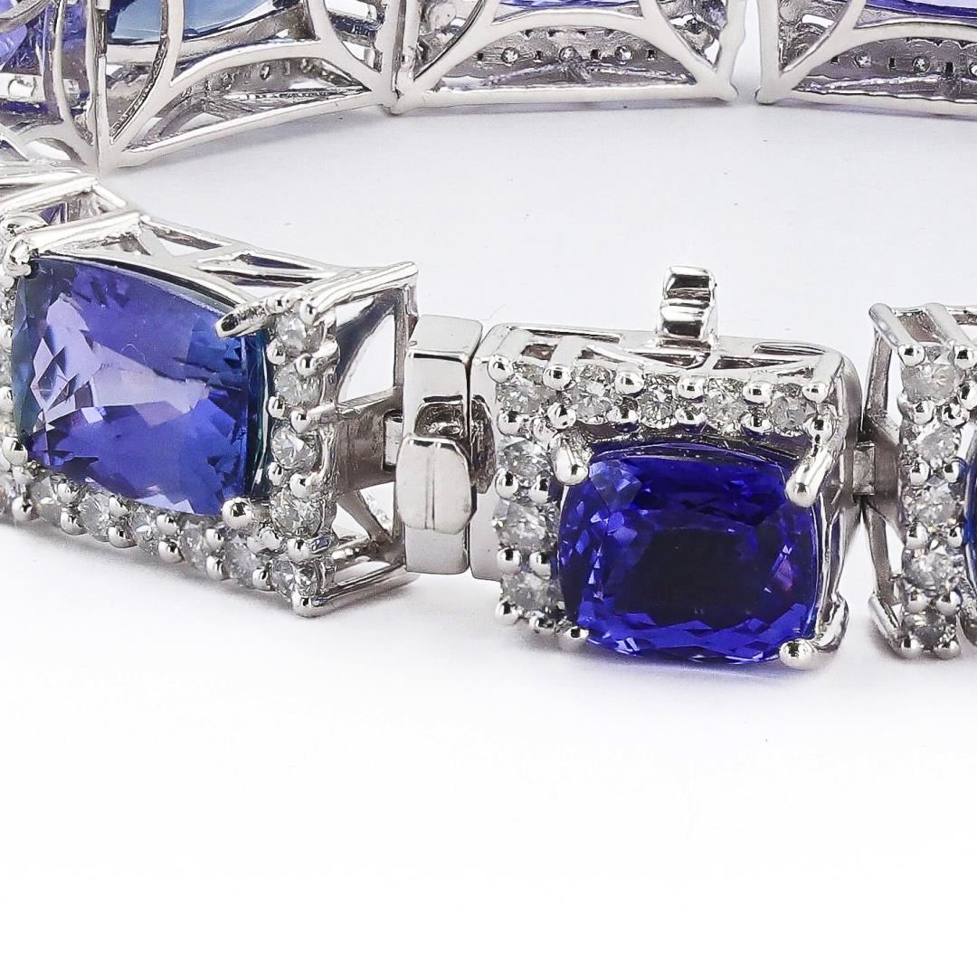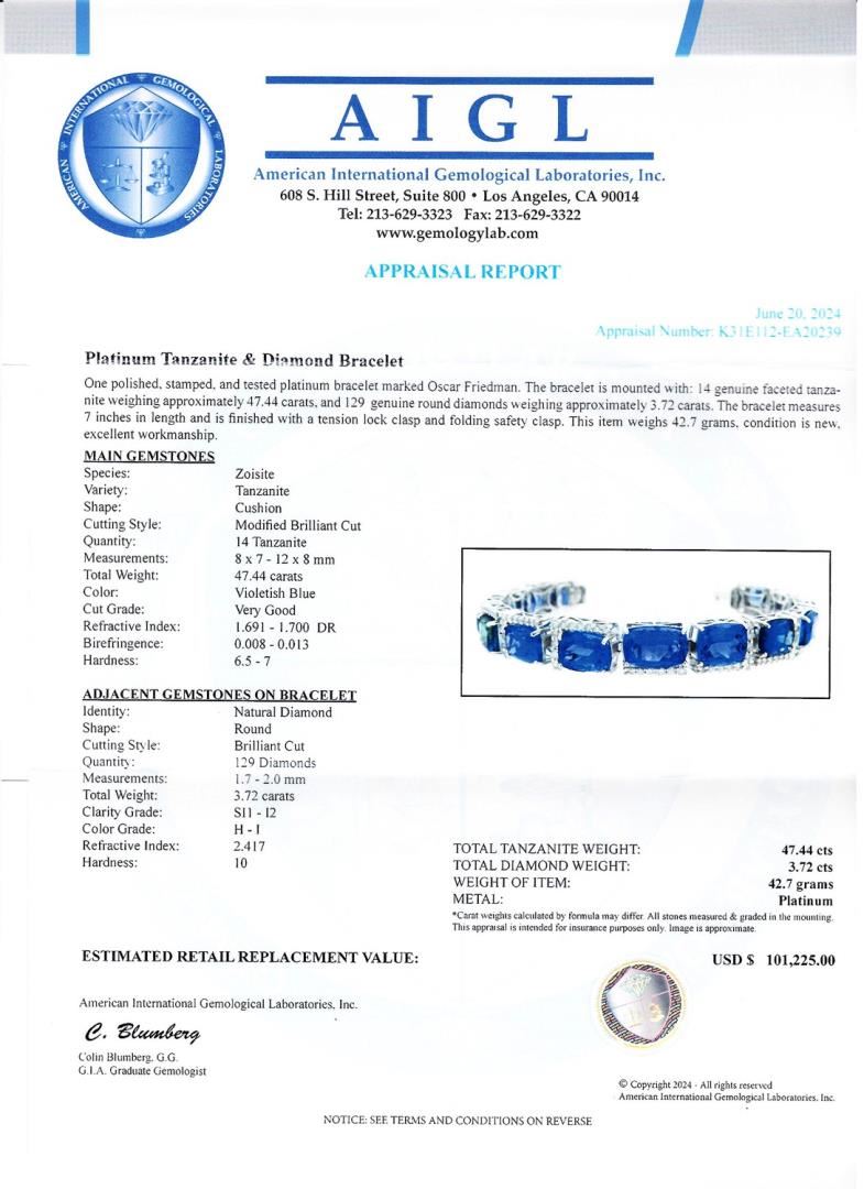One polished, stamped. and tested platinum bracelet marked Oscar Friedman. The bracelet is mounted with: 14 genuine faceted tanzanite weighing approximately 47.44 carats, and 129 genuine round diamonds weighing approximately 3.72 carats. The bracelet measures 7 inches in length and is finished with a tension lock clasp and folding safety clasp. This item weighs 42.7 grams, condition is new, excellent workmanship. #MAIN GEMSTONES# Species: Zoisite Variety: Tanzanite Shape: Cushion Cutting Style: Modified Brilliant Cut Quantity: 14 Tanzanite Measurements: 8 x 7 - 12 x 8mm Total Weight: 47.44 carats Color: Violetish Blue Cut Grade: Very Good Refractive Index: 1.691 - 1.700 DR Birefringence: 0.008 - 0.013 Hardness: 6.5 - 7 #ADJACENT GEMSTONES ON BRACELET# Identity: Natural Diamond Shape: Round Cutting Style: Brilliant Cut Quantity: 129 Diamonds Measurements: 1.7 - 2.0mm Total Weight: 3.72 carats Clarity Grade: SI1-I2 Color Grade: H-I Refractive Index: 2.417 Hardness: 10 TOTAL TANZANITE WEIGHT: 47.44 cts TOTAL DIAMOND WEIGHT: 3.72 cts WEIGHT OF ITEM: 42.7 grams METAL: Platinum #LREF-31112
