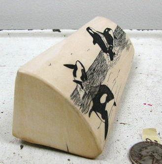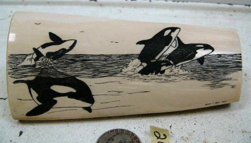 5-1/2" scrimshawed mammoth ivory of 4 killer whales by Homer Cole (114)