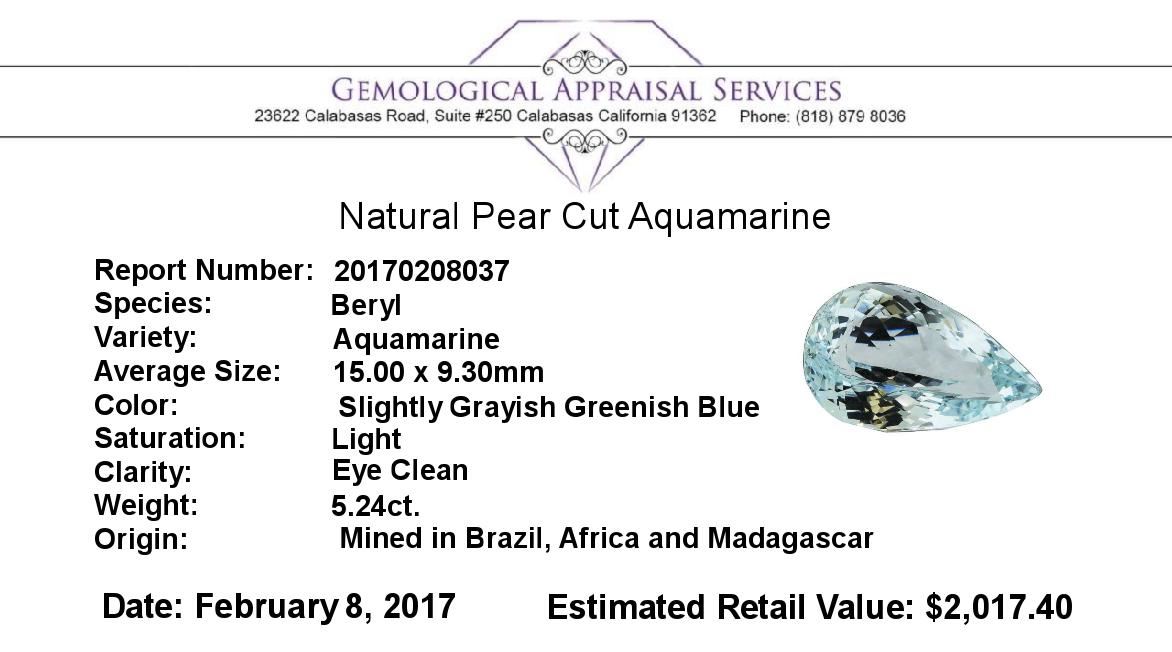 One natural pear cut aquamarine with an exact weight of 5.24ct., clarity is eye clean, slightly grayish greenish blue, light. Gemological Appraisals Services estimates the retail value at $2017.4 GAS Appraised.