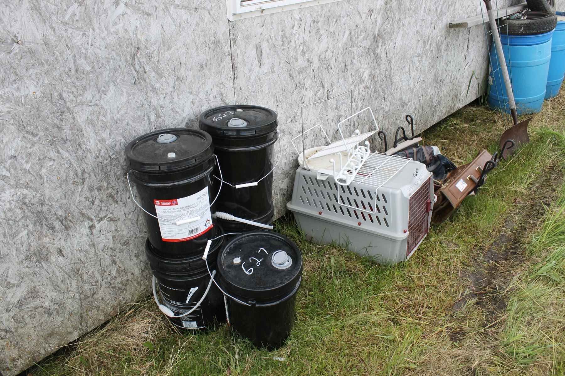 5 BLACK PAILS (EMPTY), PET KENNEL, HANGERS, ETC