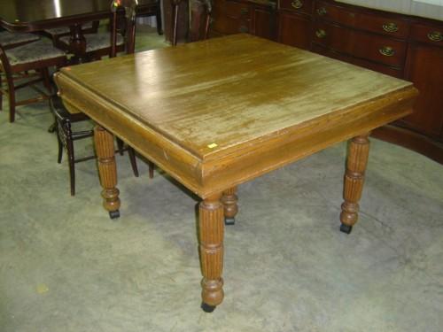5-LEGGED OAK TABLE; PULL OUT LEAFS ON END; TOP HAS WEAR IN FINISH