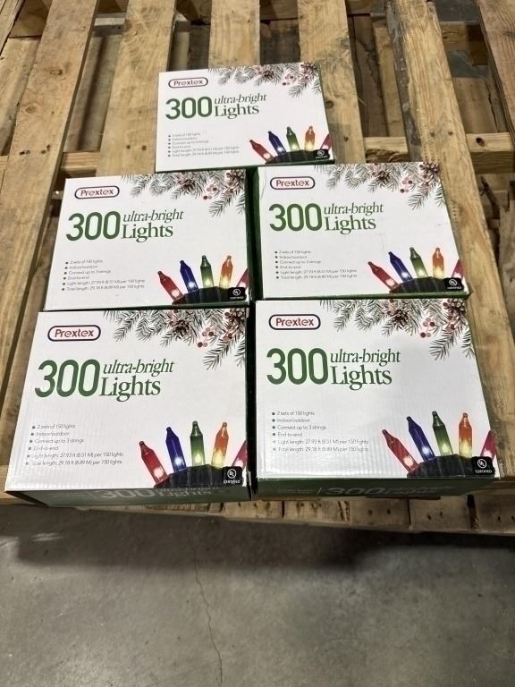 5 NEW PREXTEX 300 ULTRA BRIGHT LIGHTS CHRISTMAS LIGHT STRANDS, EACH BOX HAS 2 SETS OF 29FT STRANDS, TOTAL 10 150 LIGHT 29.18FT STRANDS, MULTI BULB, GREEN WIRE