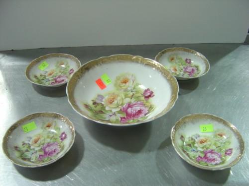 5-PIECE BERRY BOWL SET; PAINTED ROSES; MARKED KLONDIKE MADE IN GERMANY