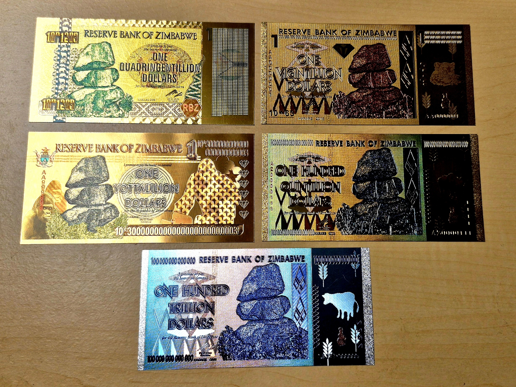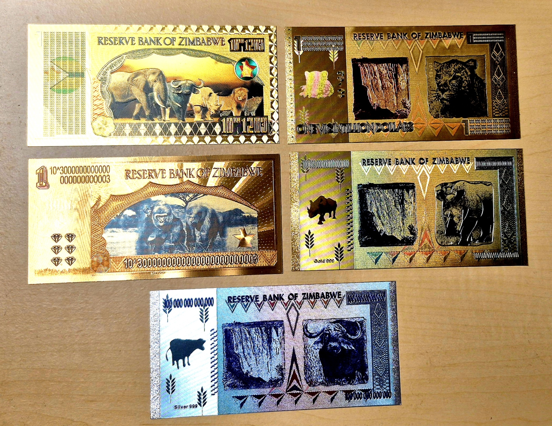 5 Pc Set Pure 24k .999 Gold Foil Bank Note Of The Reserve Bank Of ZIMBABWE - Each In Mint Condition - Each Note Is An Exact Replica of ZIMBABWE Currency Processed in Pure Gold Foil, Colorized and Embossed, producing a shimmering golden collectible piece of World Numismatic Notes. The gold foil is sealed between ultra thin super clear laminate. Overall weight of each note is 3 to 4 grams.