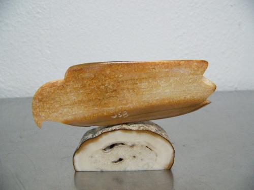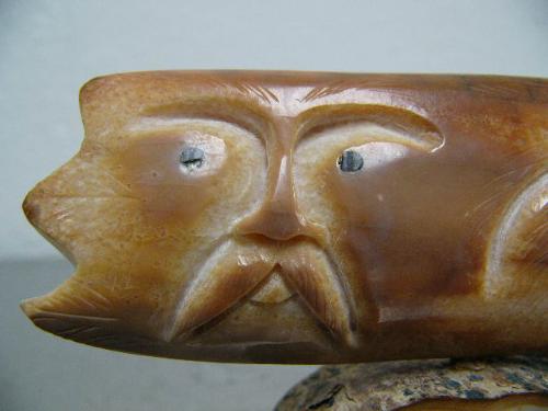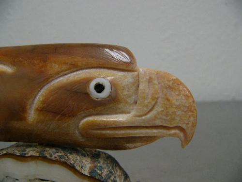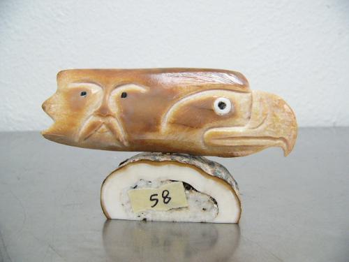 5" fossilized ivory eagle's head and man's face with inset baleen and ivory eyes mounted on fossilized ivory base by Jim Bell from Whittier, AK ()