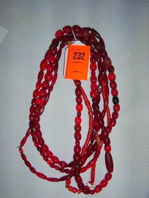 5 strands: 4 strands primo red vaseline glass beads. One strand 'tile' glass beads.