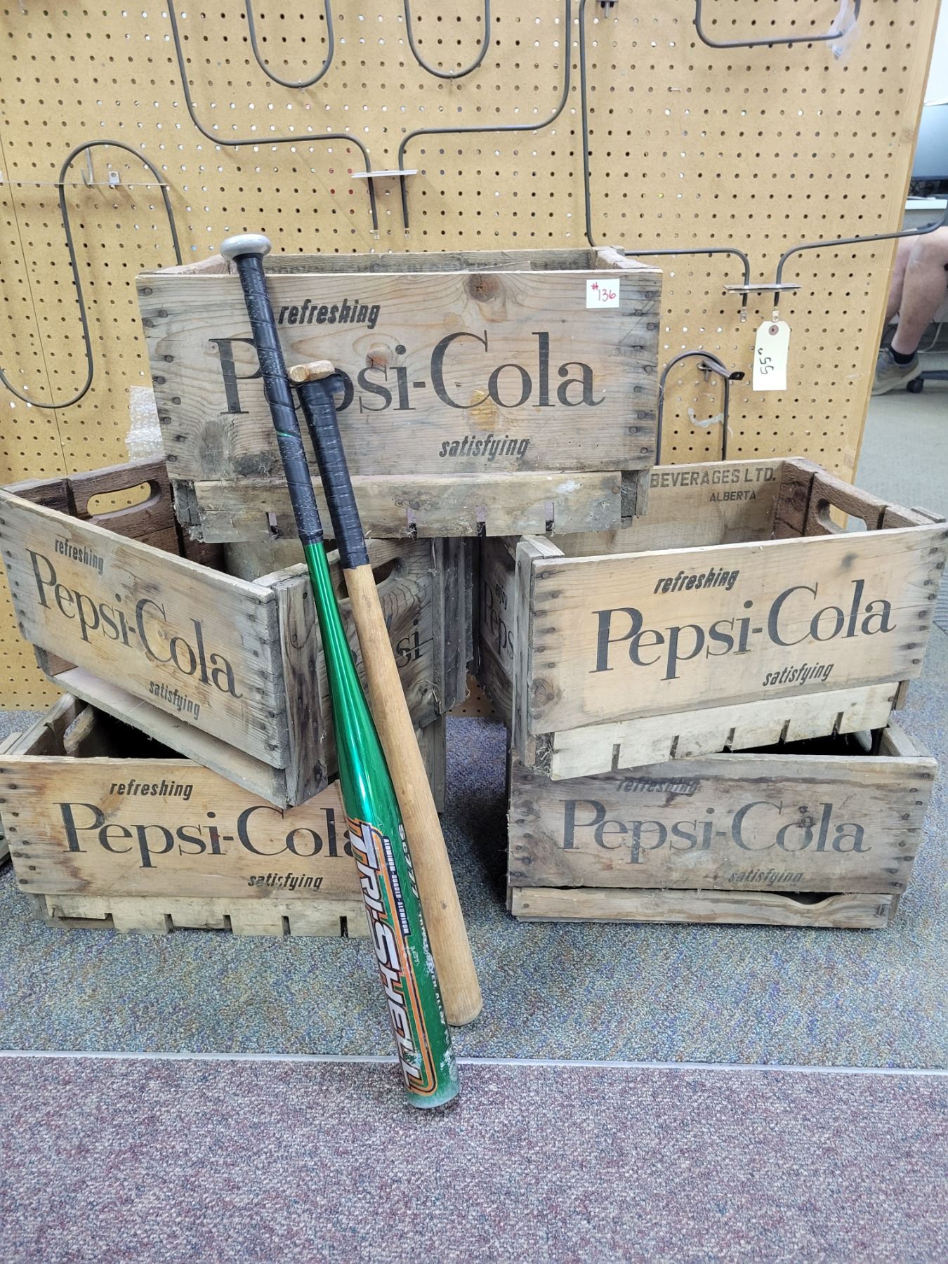 5 wooden Pepsi boxes and 2 softball bats