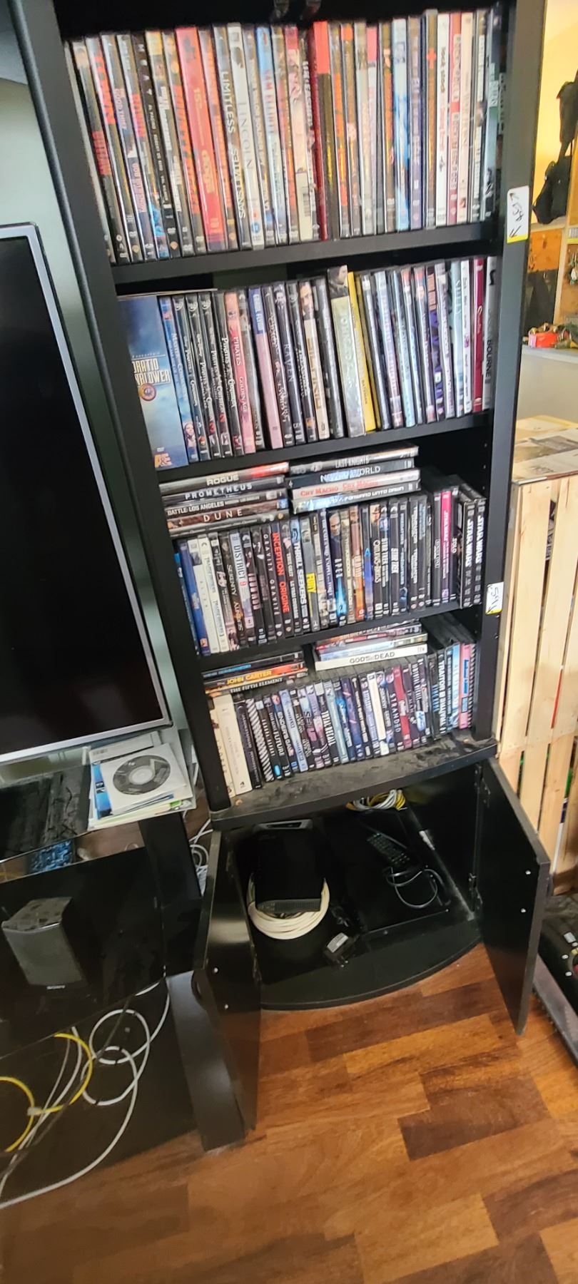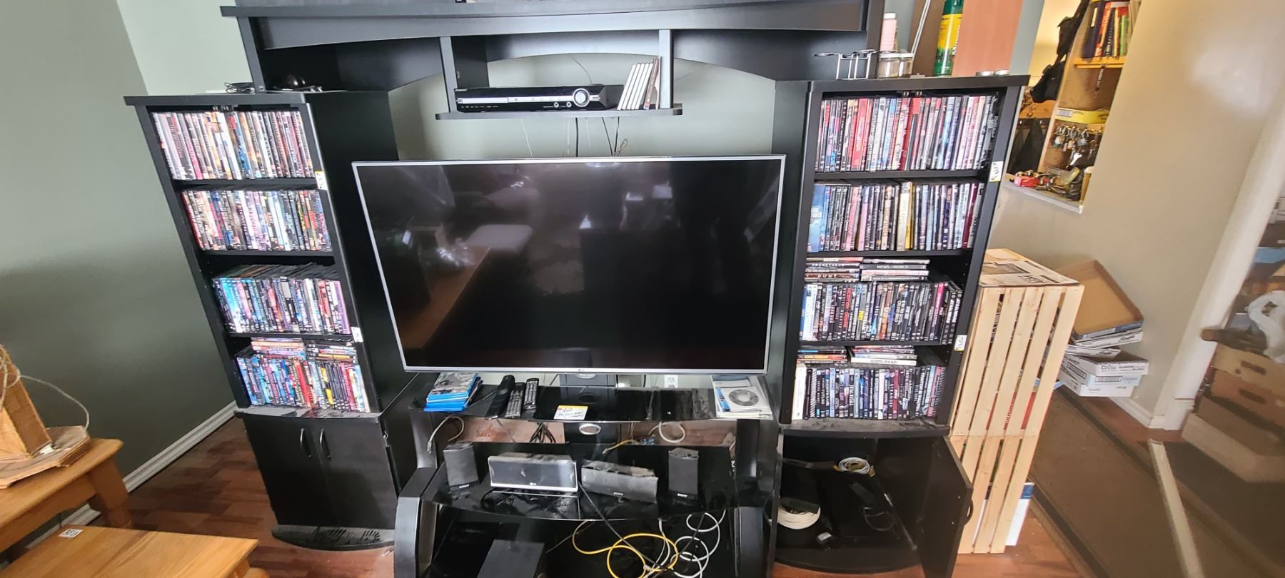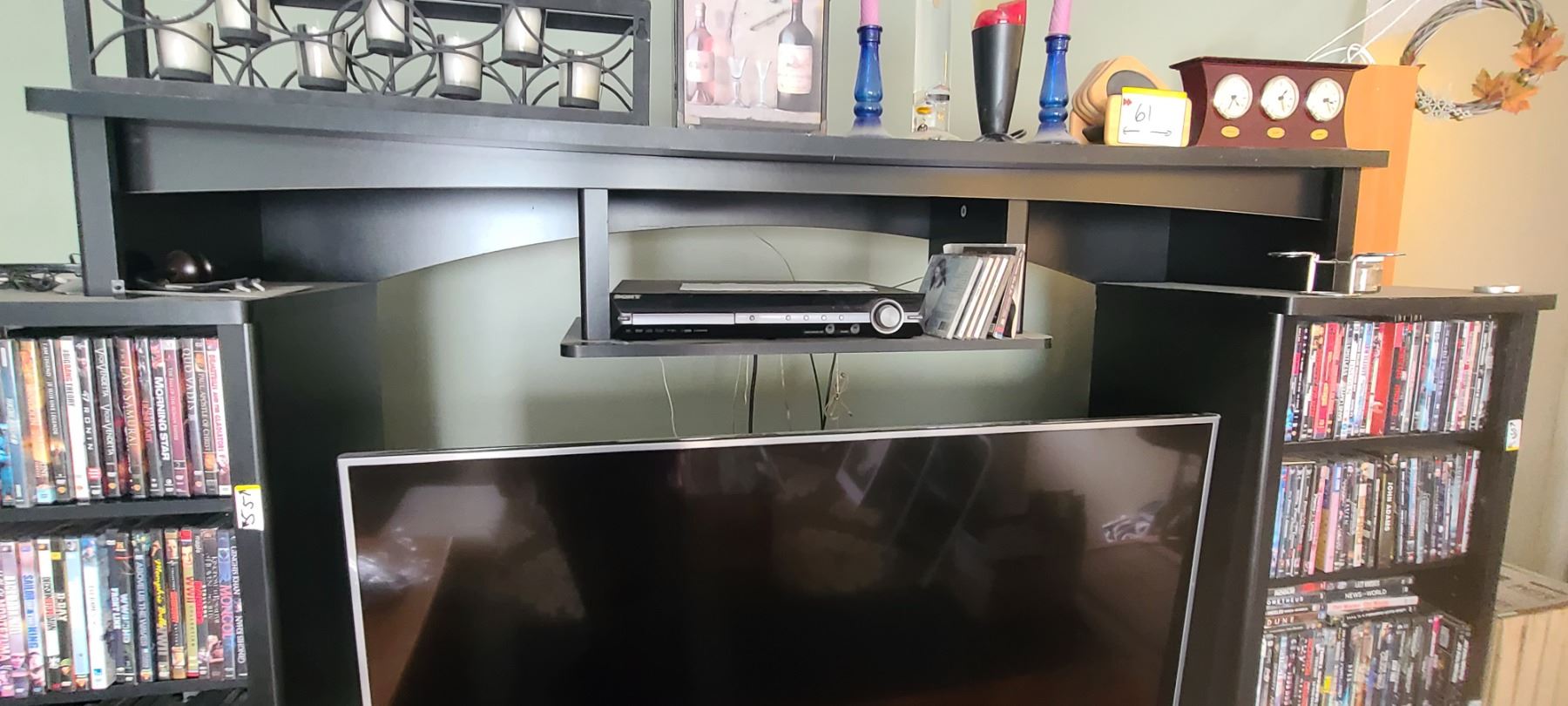 54" LG TV, SONY DVD PLAYER, REMOTES, SPEAKERS, AND TV STAND/CABINET