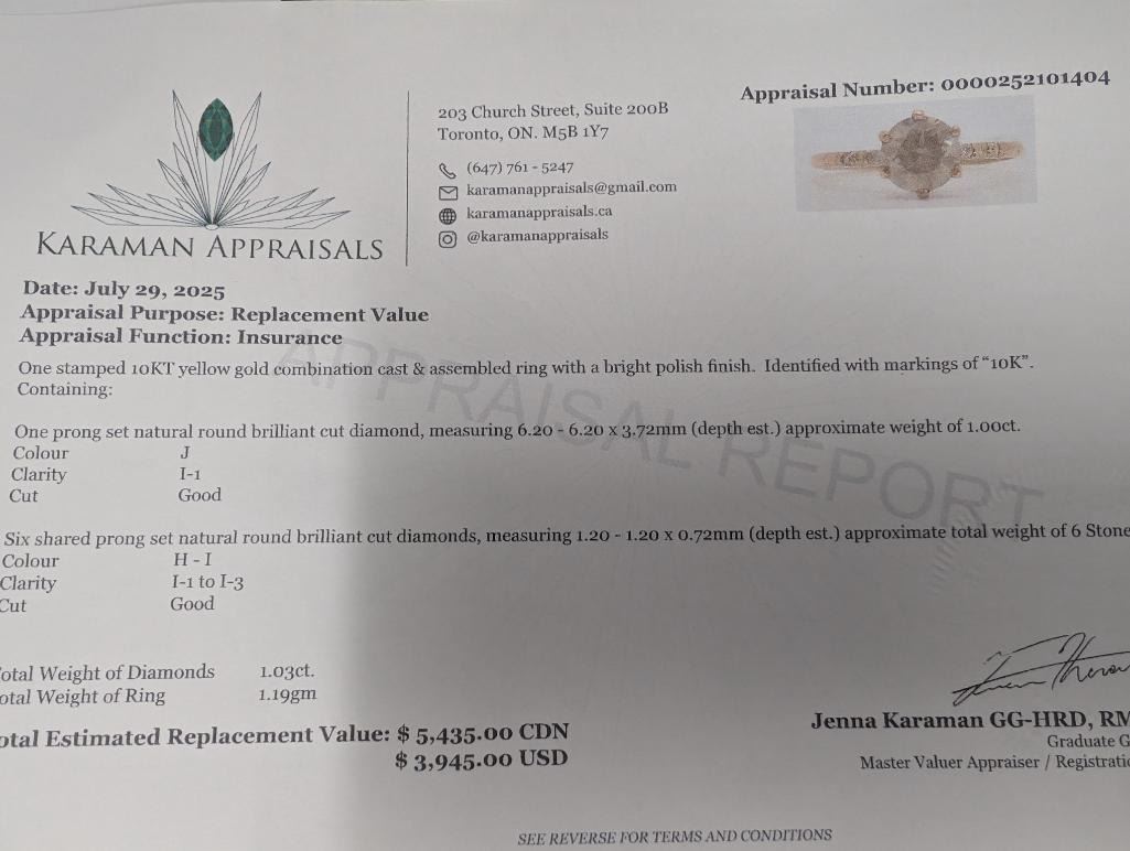 $5435, 10K(1.19g), NATURAL DIAMOND (1+0.03ct)RING, size 6.75, appraised value $5435