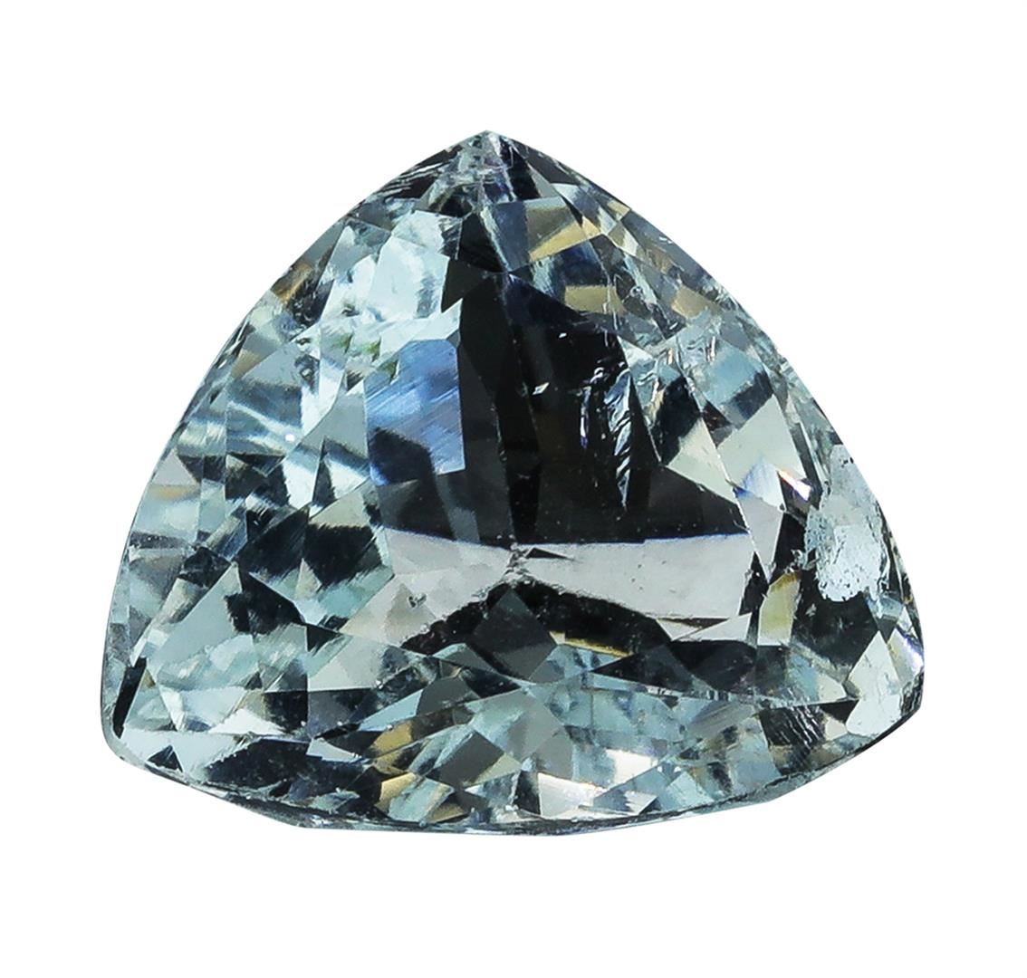 One natural trilliant cut aquamarine with an exact weight of 6.10 ct., clarity is slightly included, slightly grayish greenish blue, light. Gemological Appraisals Services estimates the retail value at $2348.5 GAS Appraised.