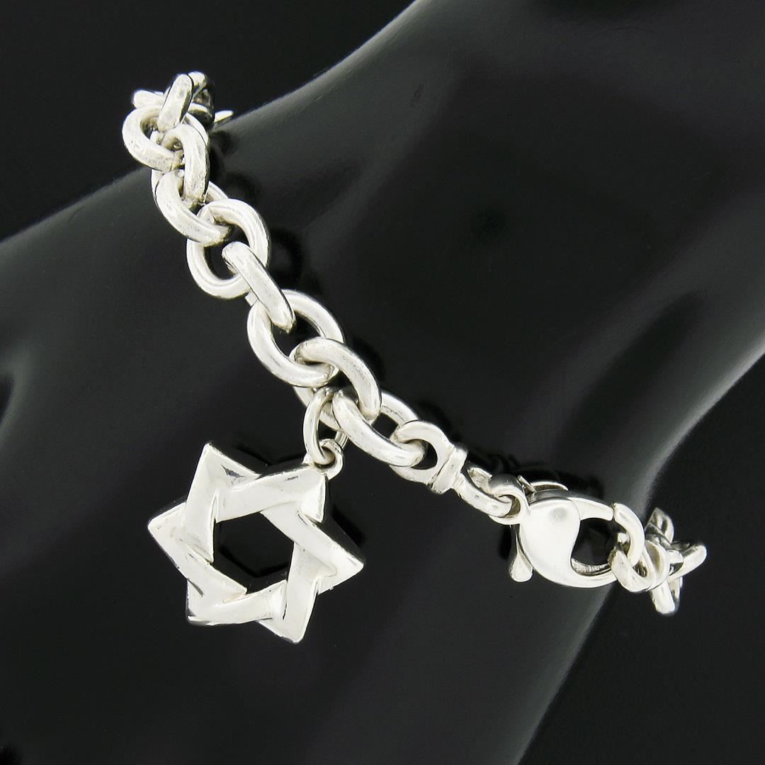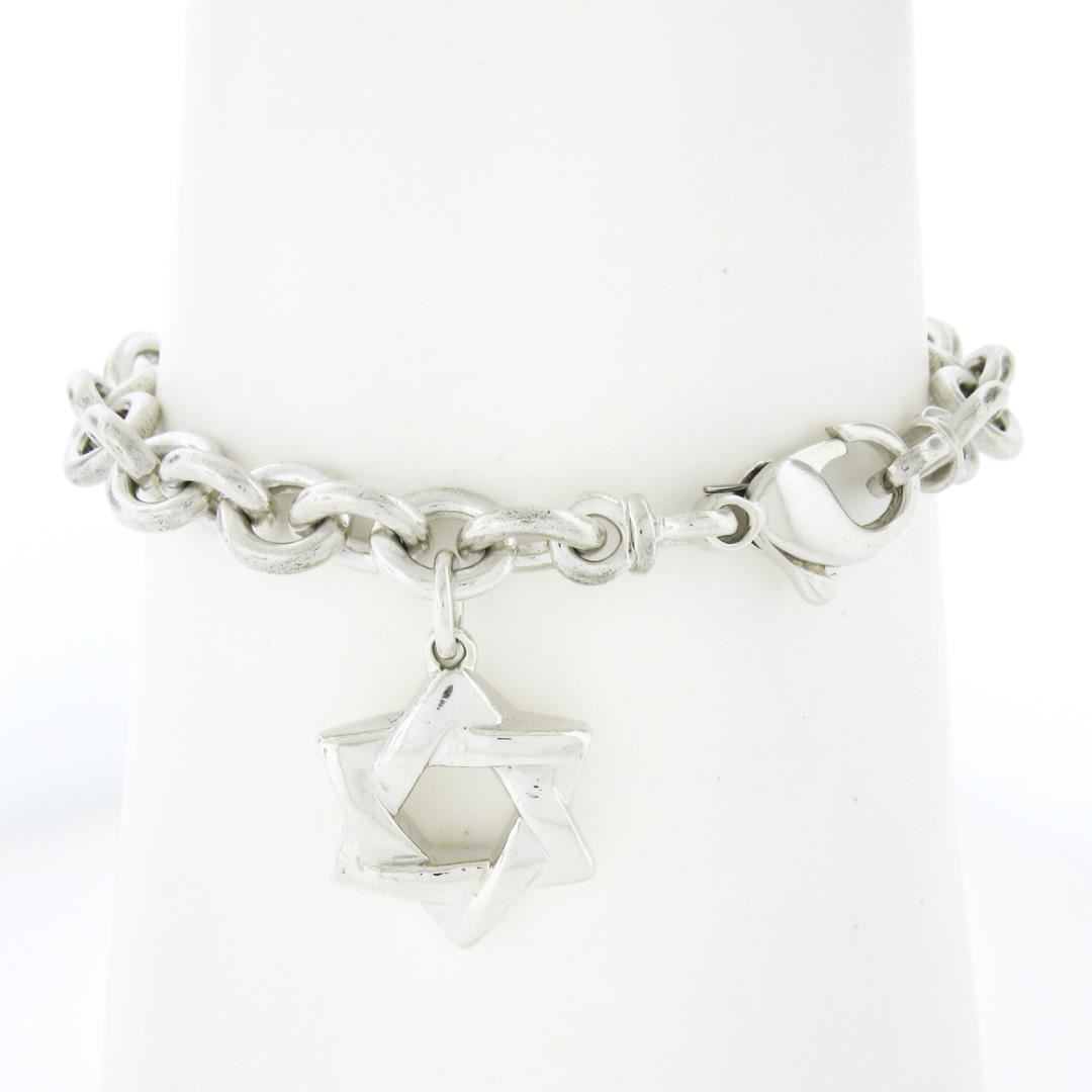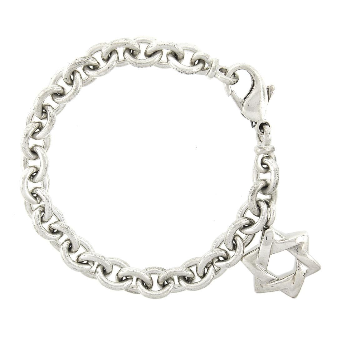 A solid silver star of David dangle charm round link bracelet by MOVADO. It weighs a total of 29.61 grams, measures 7.8mm wide, and measures 6.25 inches in length, the charm measures 25.1x17mm.