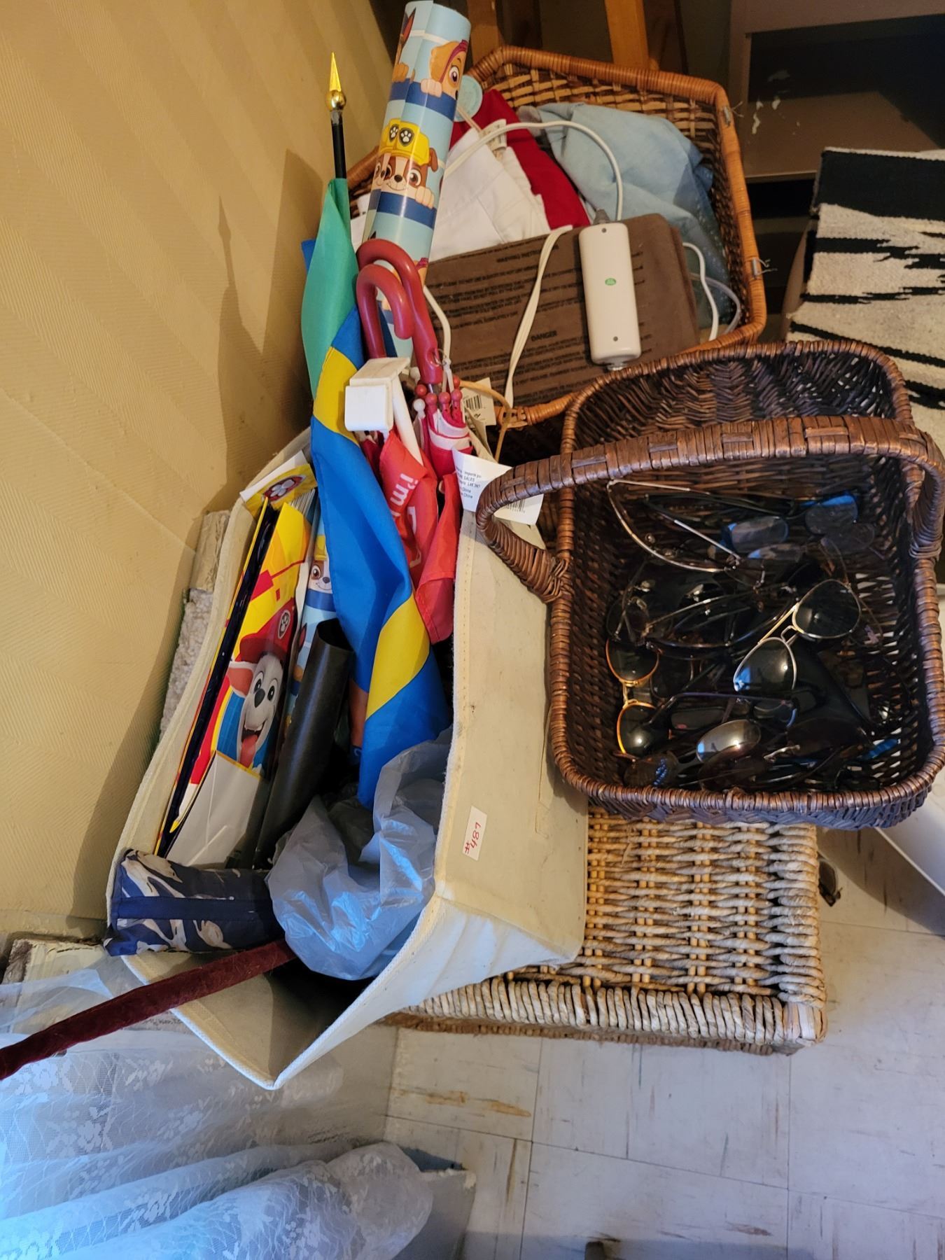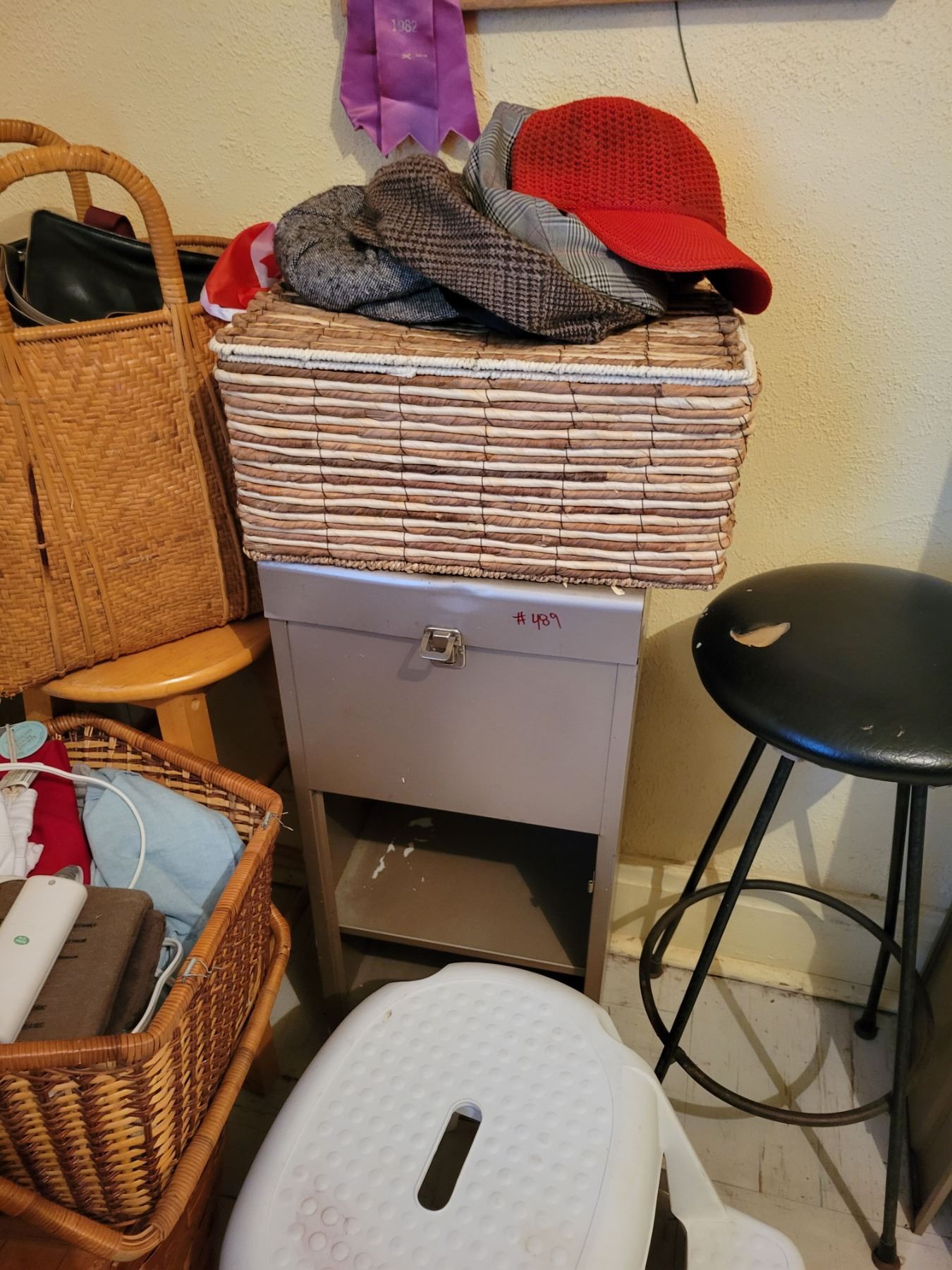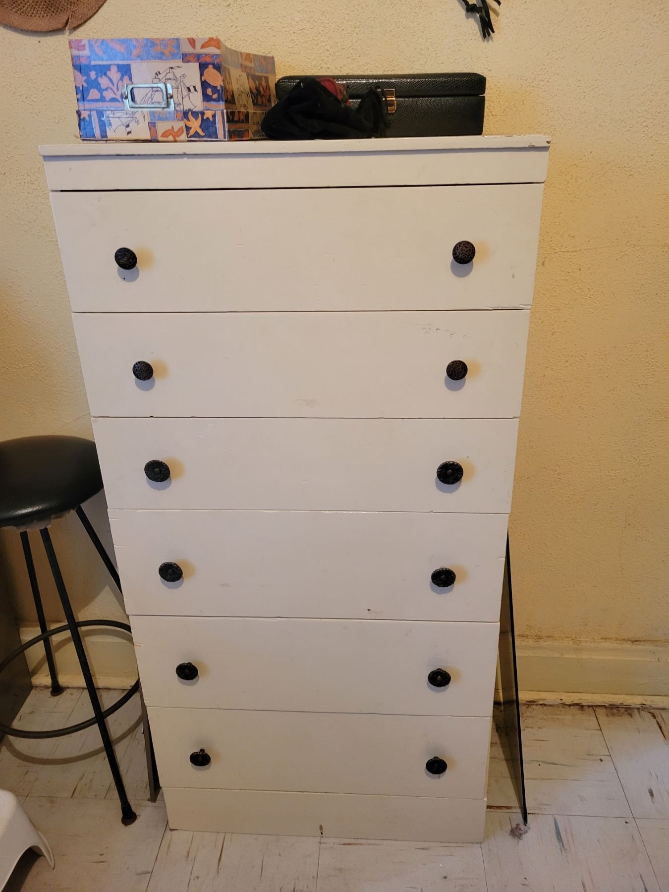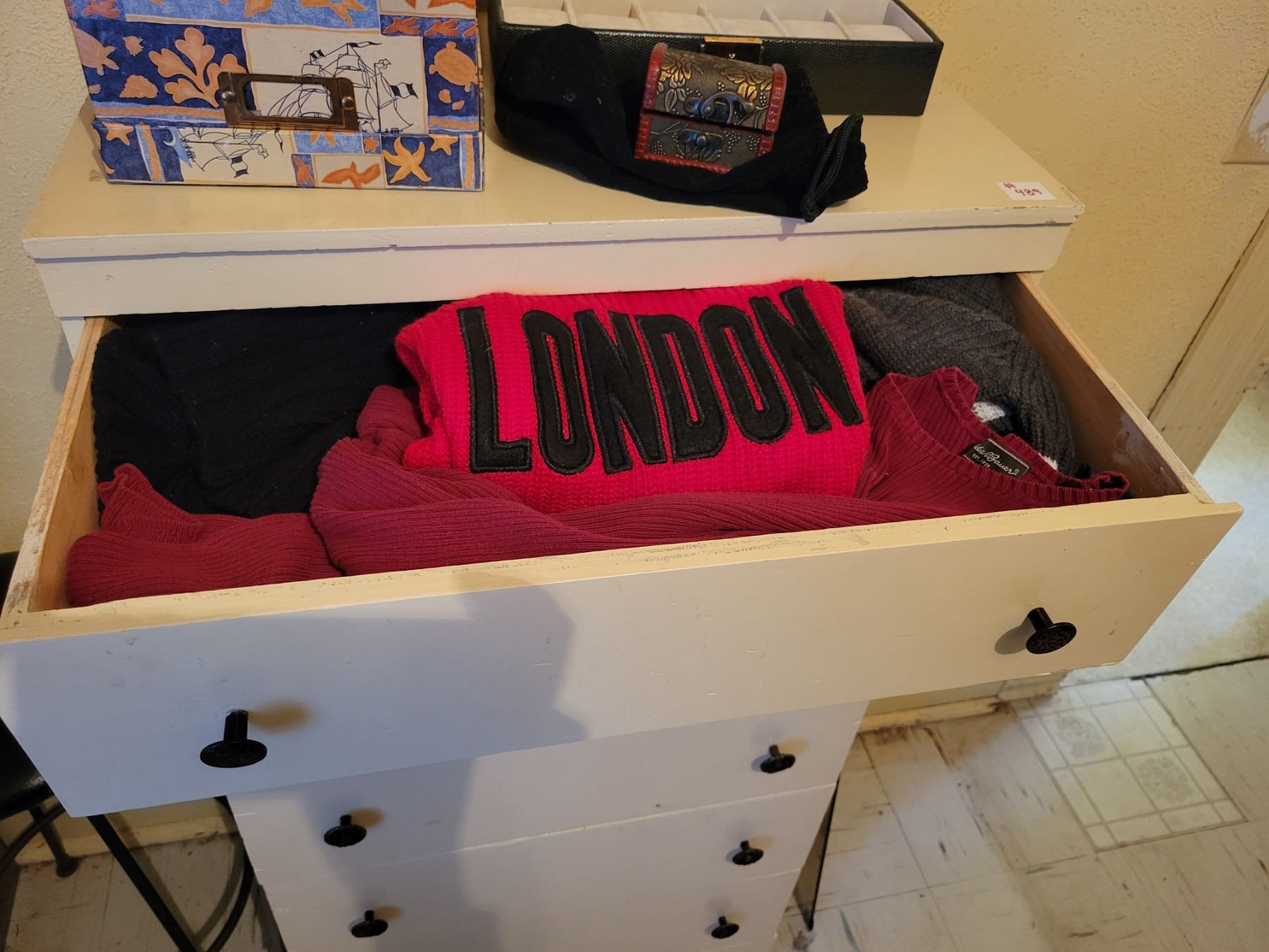 6 Drawer dresser, clothes, hats, baskets, 2- stools and misc.