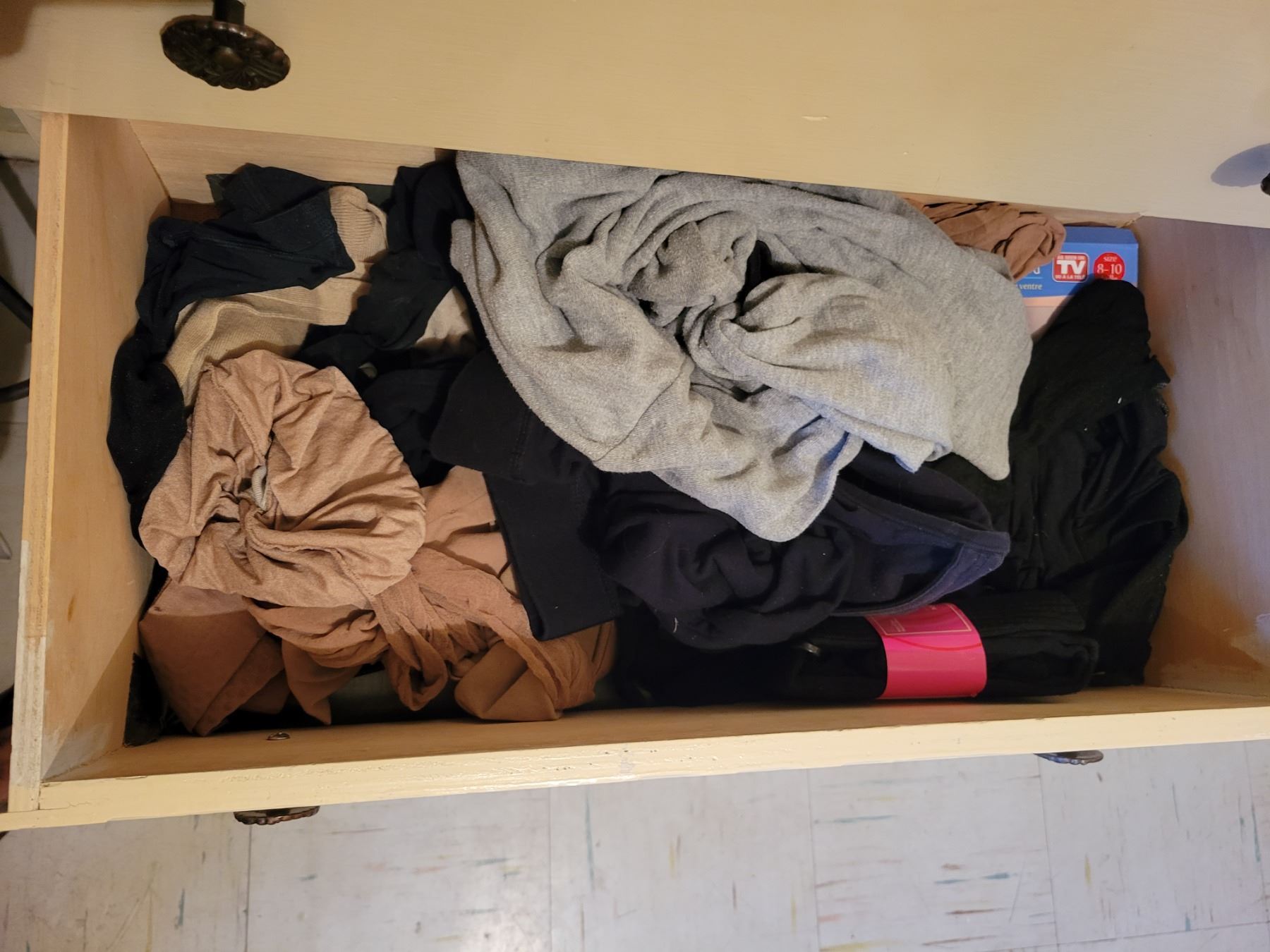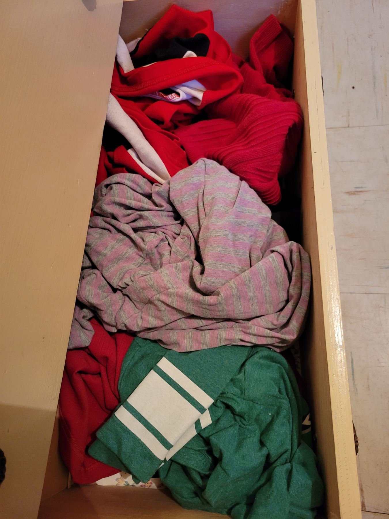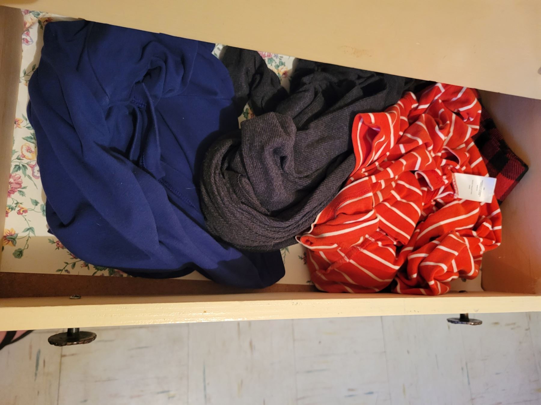 6 Drawer dresser, clothes, hats, baskets, 2- stools and misc.