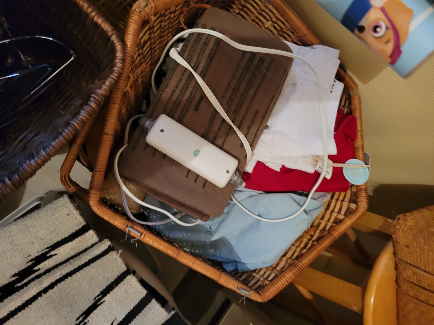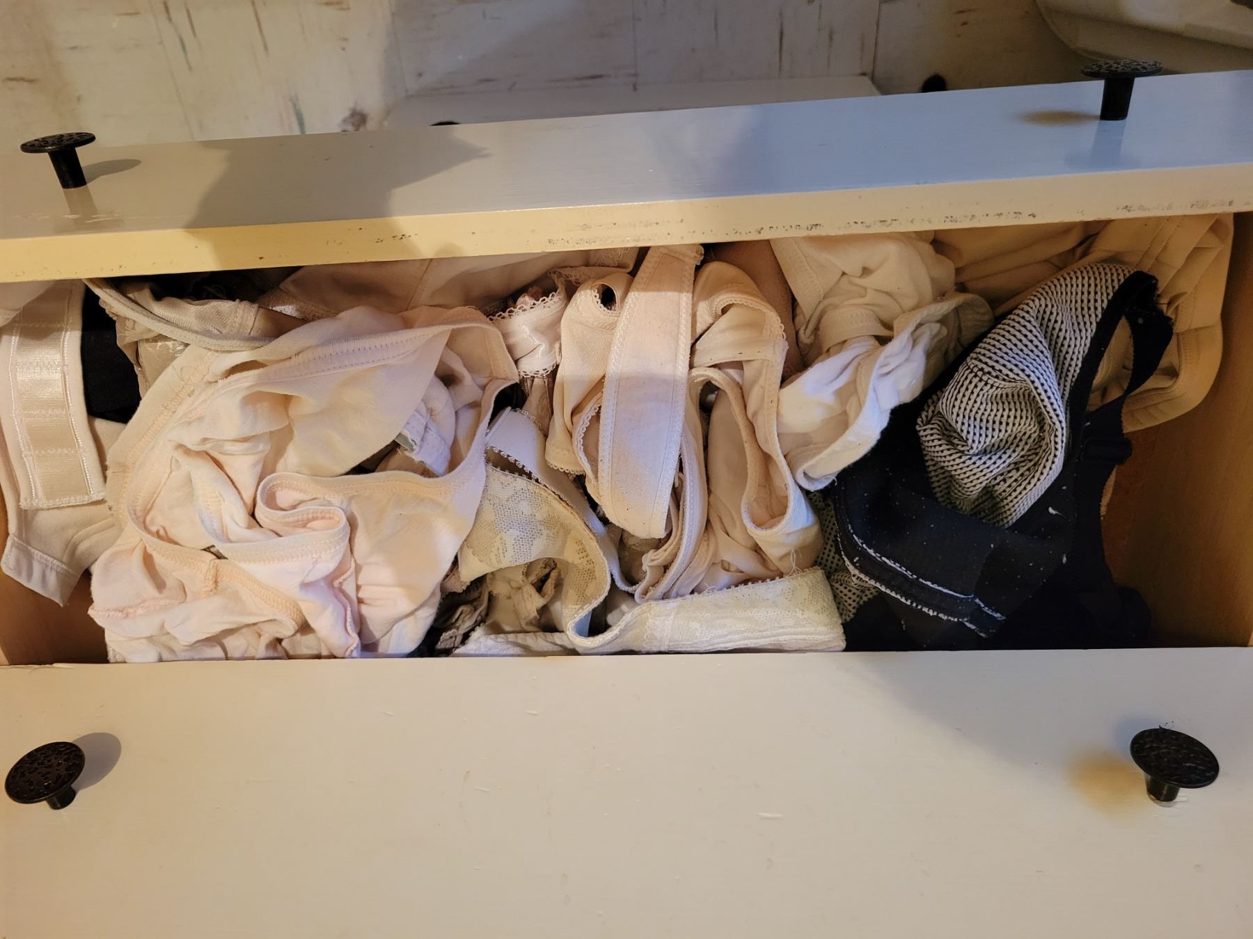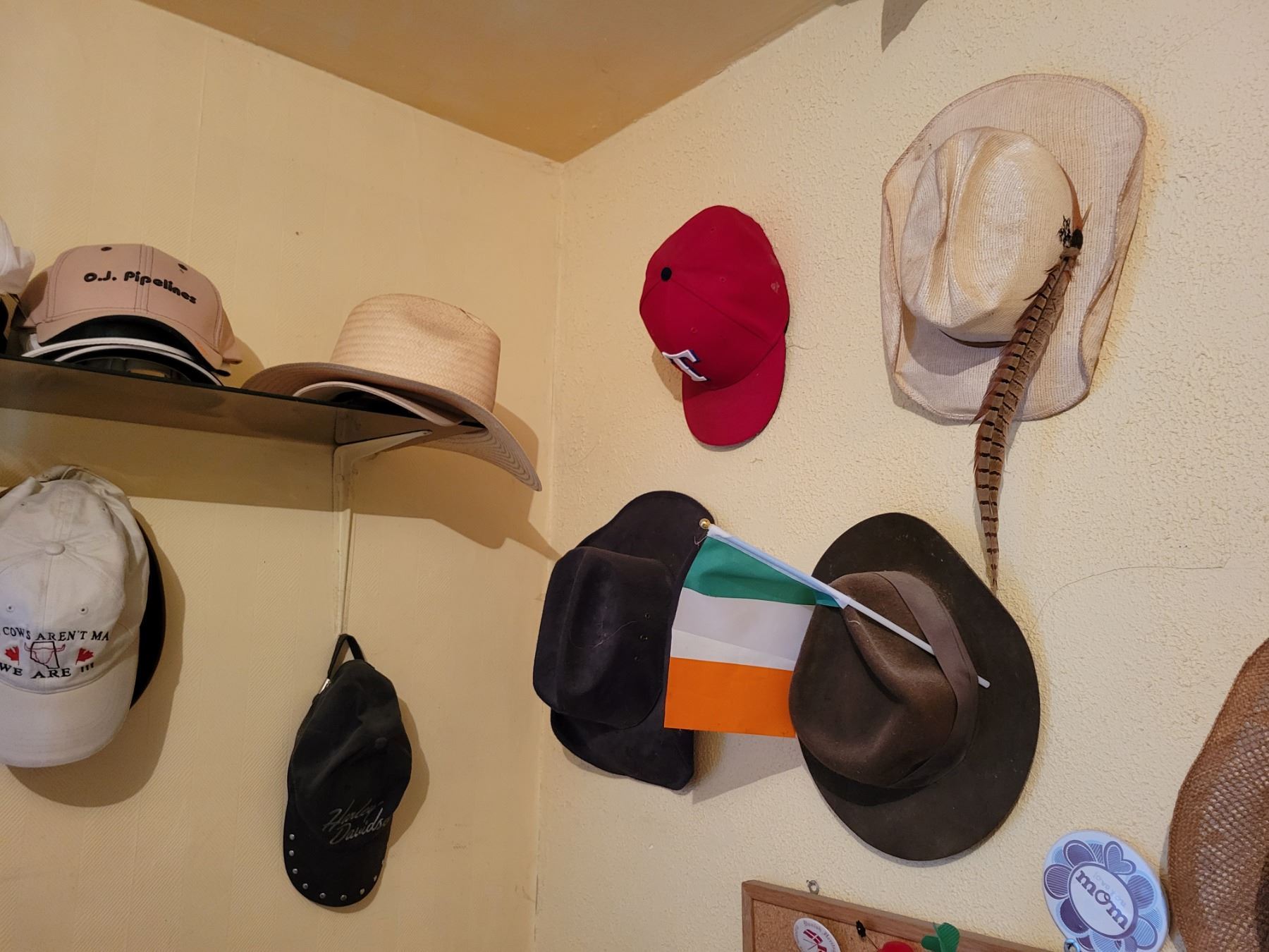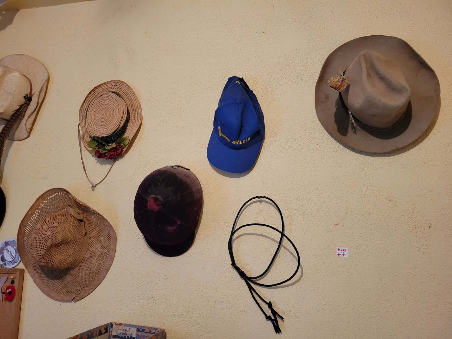 6 Drawer dresser, clothes, hats, baskets, 2- stools and misc.
