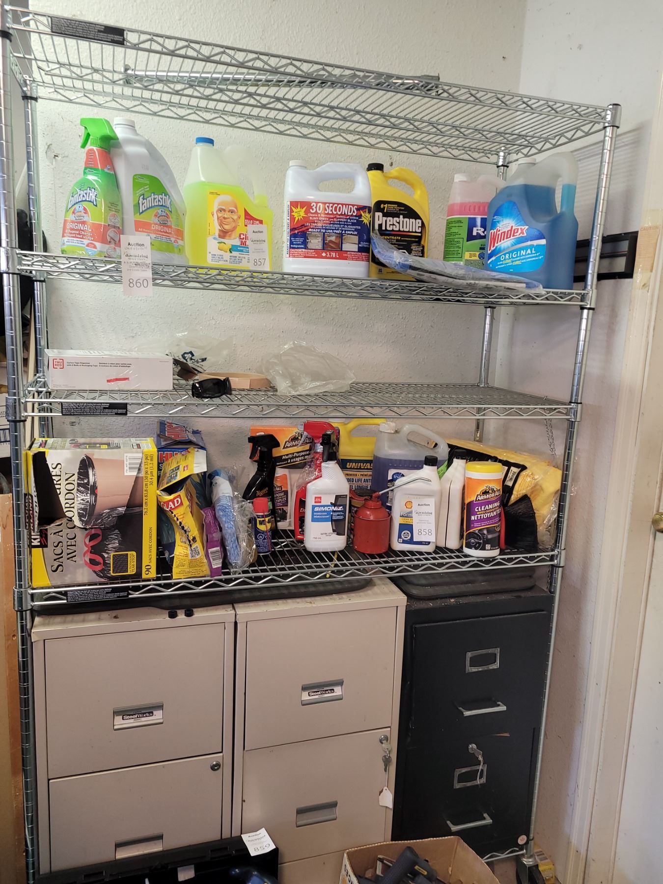 48x18x71. Contents not included. Includes 2 shelves where filing cabinets are. Filing cabinets not included. Category C. Pick up at 1pm.