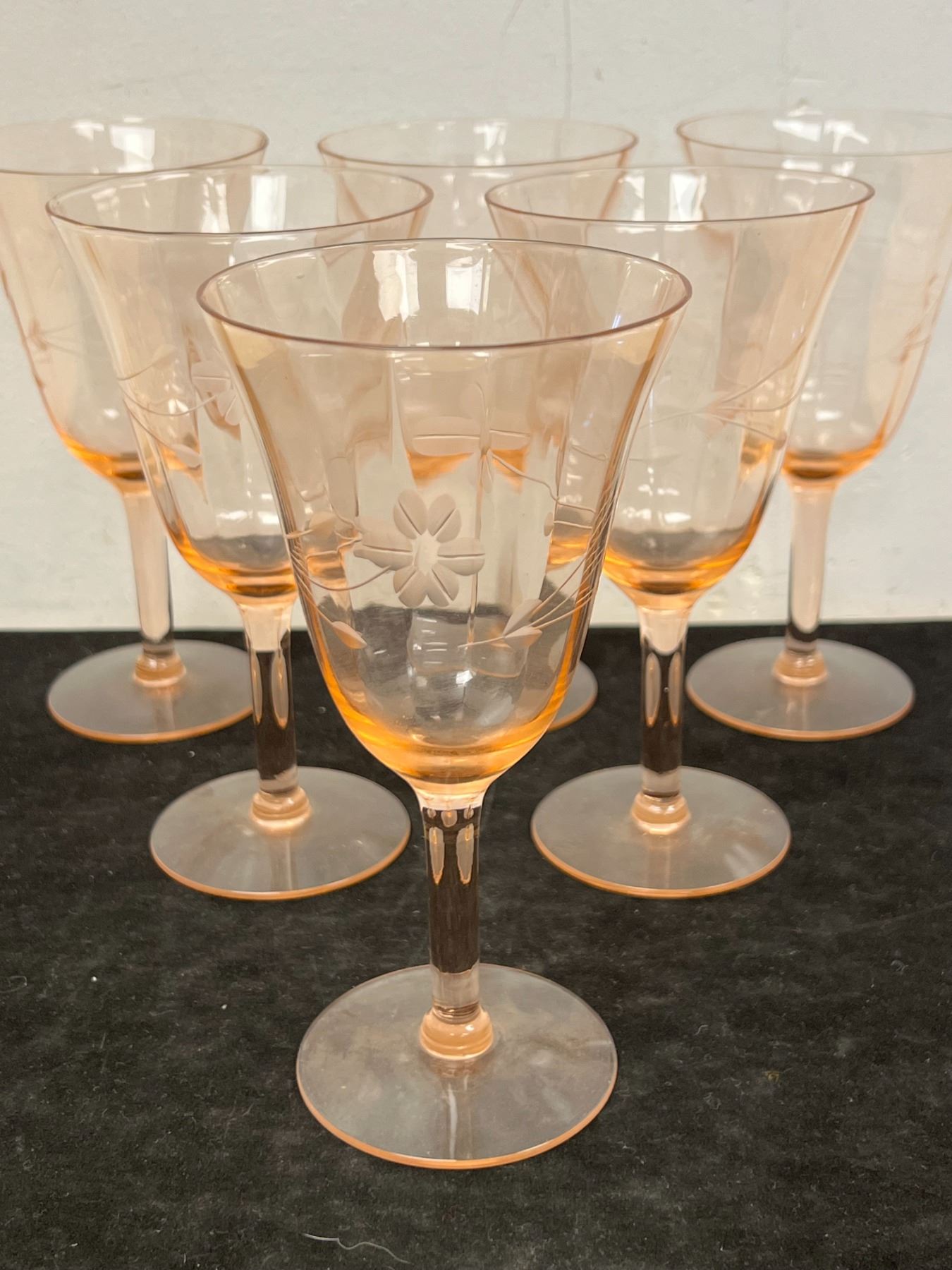 6 Vintage Pink Wine Glasses with Floral Etching 6.5" tall nice overall
