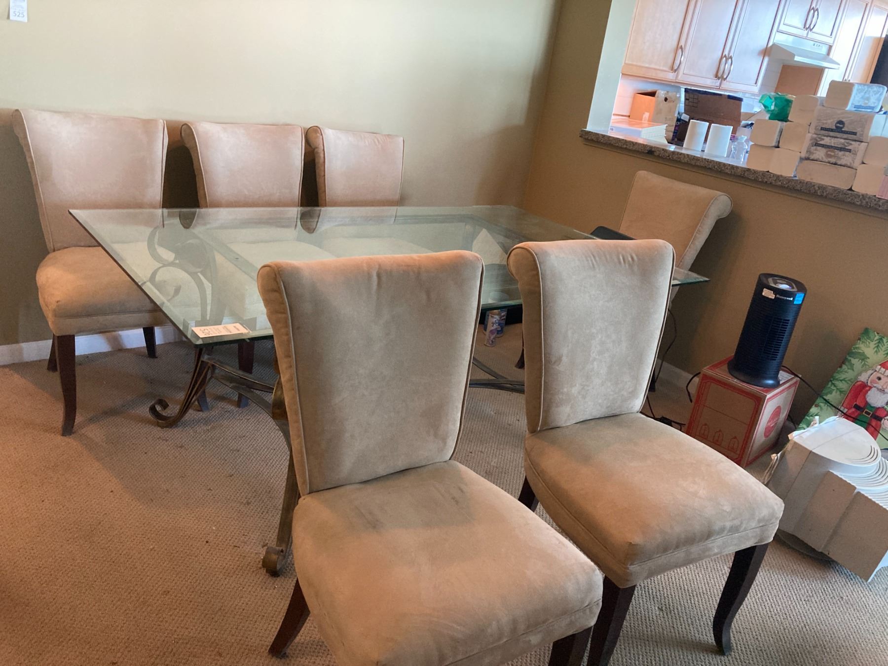Six micro- suede chairs 21x25x38. Note stains & wear Bring help to remove. Pickup 11-12pm.