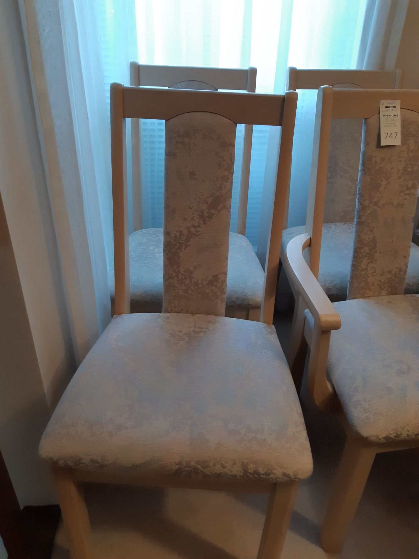 Six upholstered dining chairs, four 29x19x40, and 2 captains chairs 23x19x40. Bring help to move. Pickup 11 am.