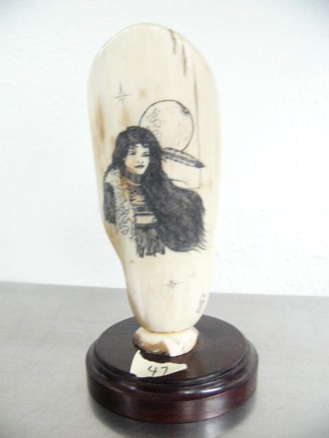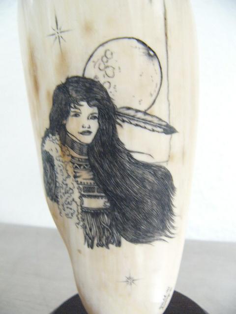 6" mammoth ivory scrimshawed with beautiful Indian maiden by Homer Cole done in 1998 Anchorage ()