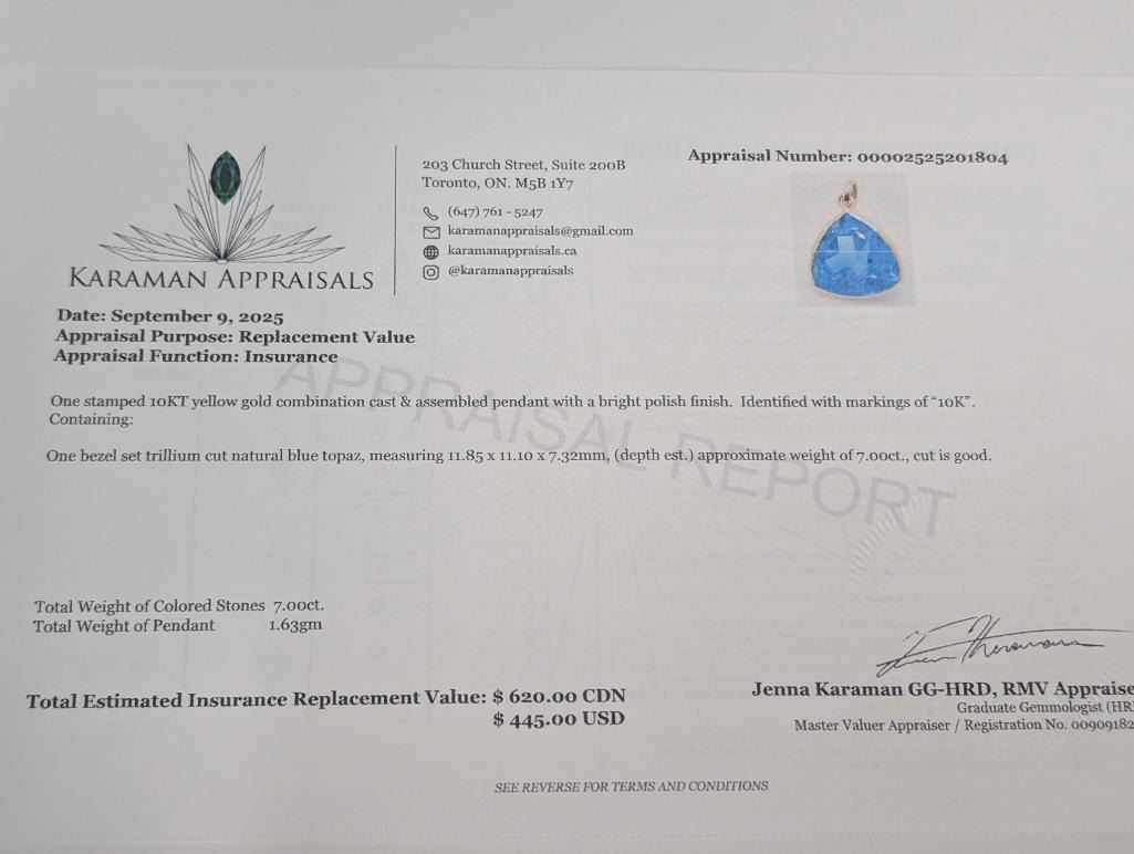 $620, 10K(1.63g), BLUE TOPAZ (7ct)PENDANT, appraised value $620