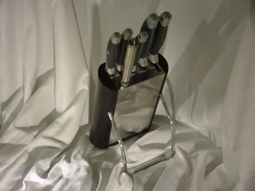 Set includes: Chef Knife, Slicing Knife, Boning Knife, Utility Knife, Paring Knife, Sharpener and Block to Hold Knives.