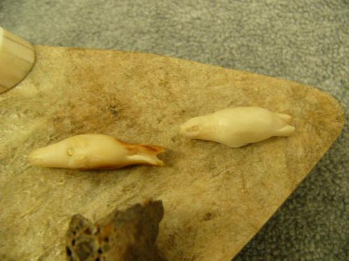 7 ivory carved animals: polar bear, walrus and seals mounted on bone with baleen hair by David Sodook of Diomede, AK 11.75" (33)