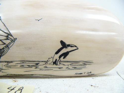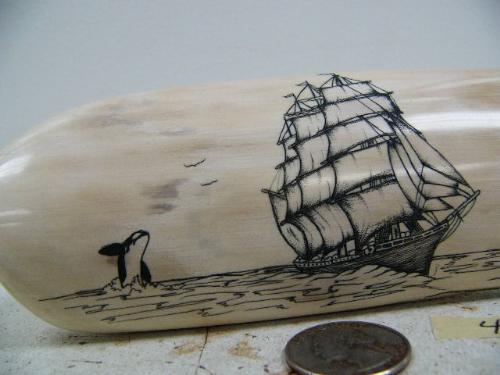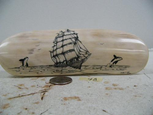 7" mammoth ivory scrimshawed with sailing vessel and 2 killer whales by Homer Cole (114)