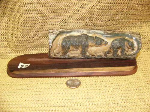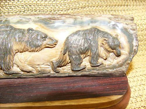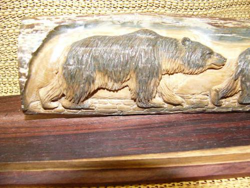 7" relief carved mammoth ivory with 2 grizzly bears M006 (2)