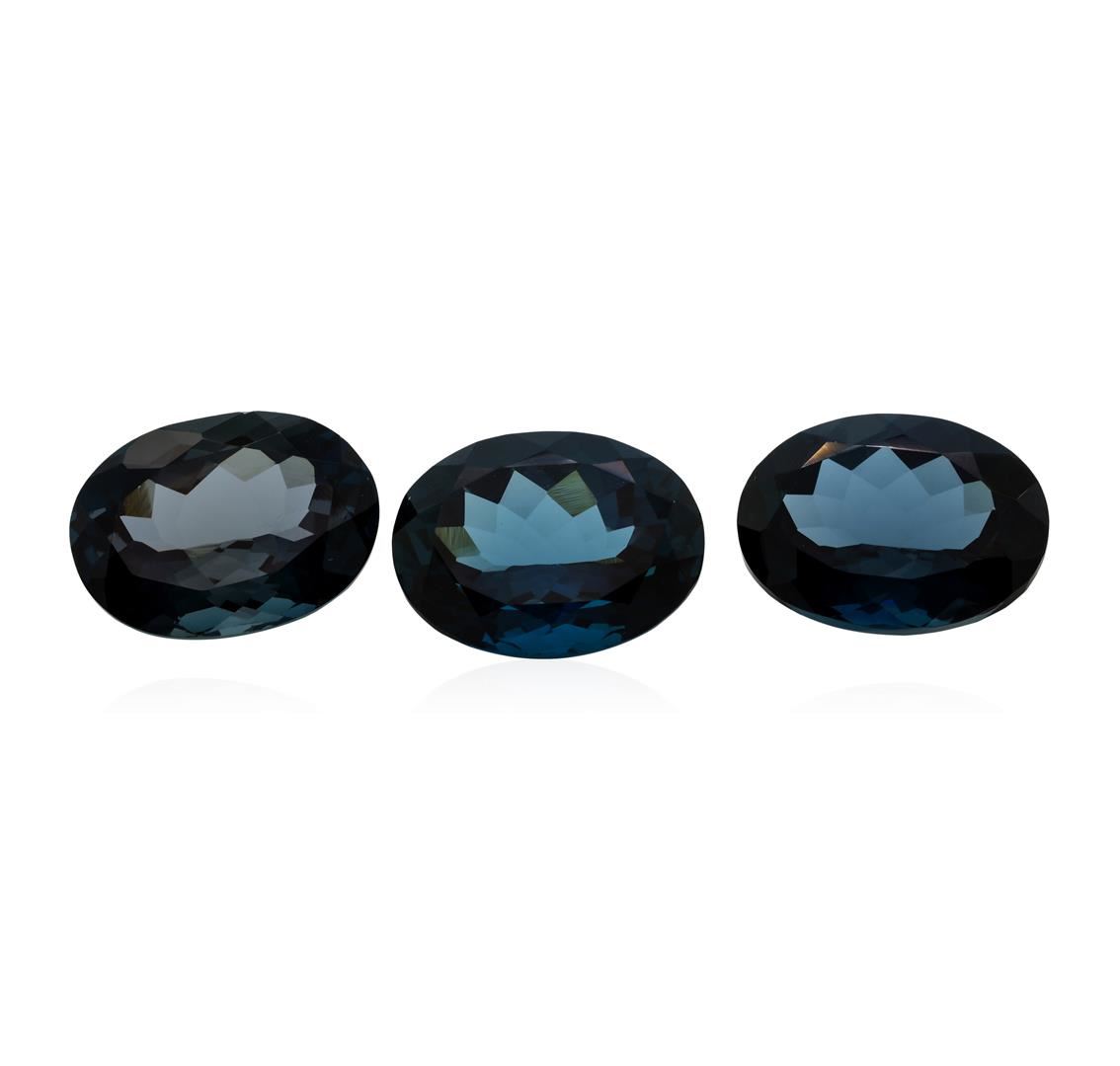 One natural oval cut london blue topaz parcel of three with an exact weight of 70.44ctw., clarity is eye clean, slightly grayish greenish blue, dark to medium dark. Gemological Appraisals Services estimates the retail value at $1408.8 GAS Appraised.