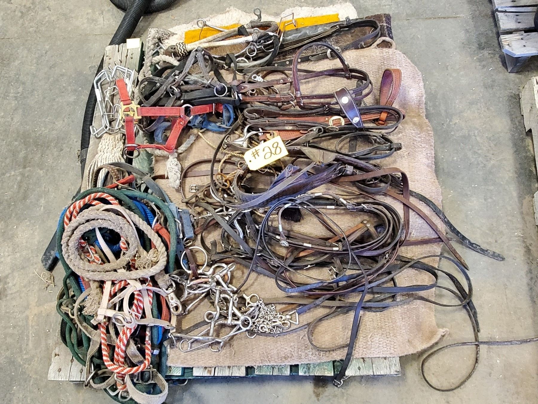 8 BRIDLES, REINS, 3 HACKMORES, 4 COLT HALTERS, 3 SADDLE BLANKETS
