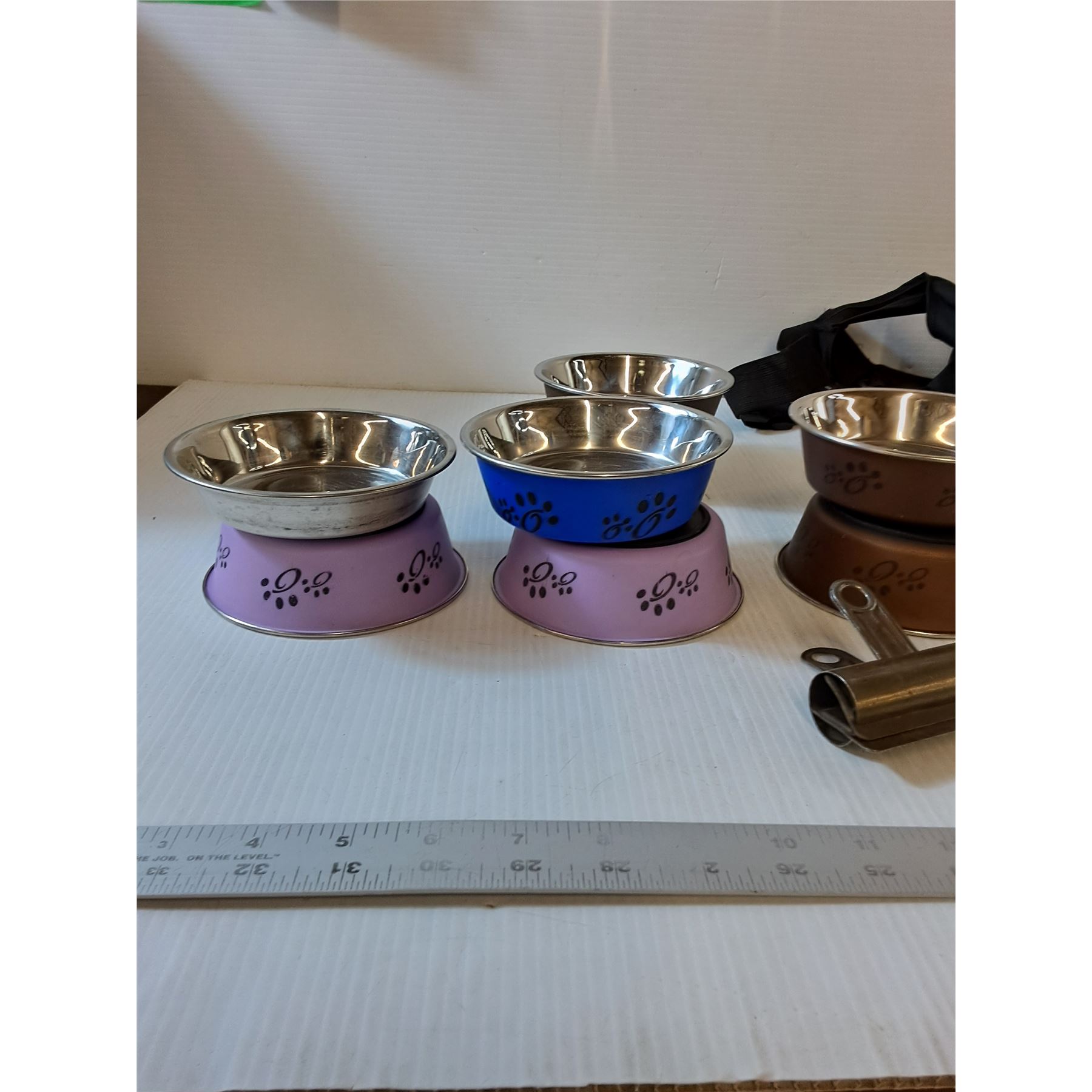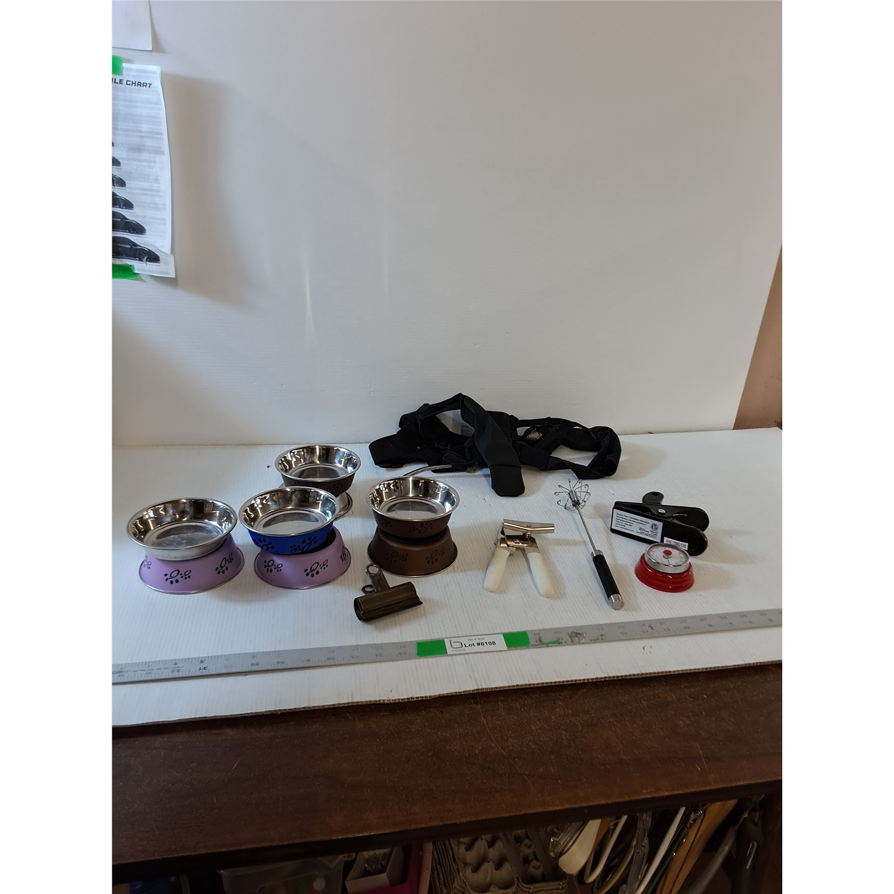 (8) Cat Bowls, Can Opener, Whisk, Timer, Clamp, Harness