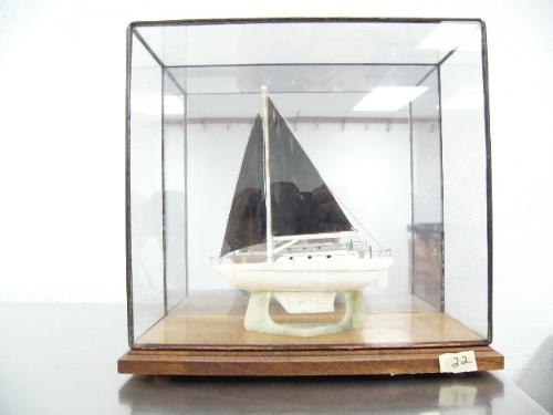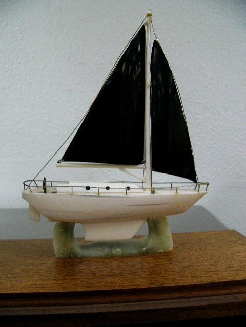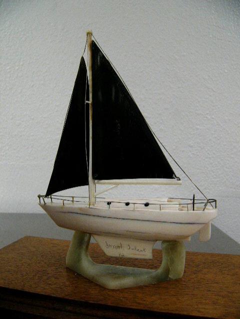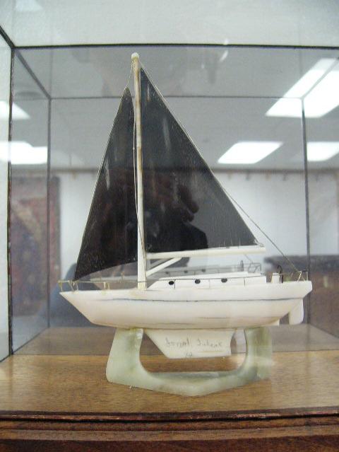 8" white ivory and baleen sailing ship by Jonal Tulek from Nome, AK- in glass case ()
